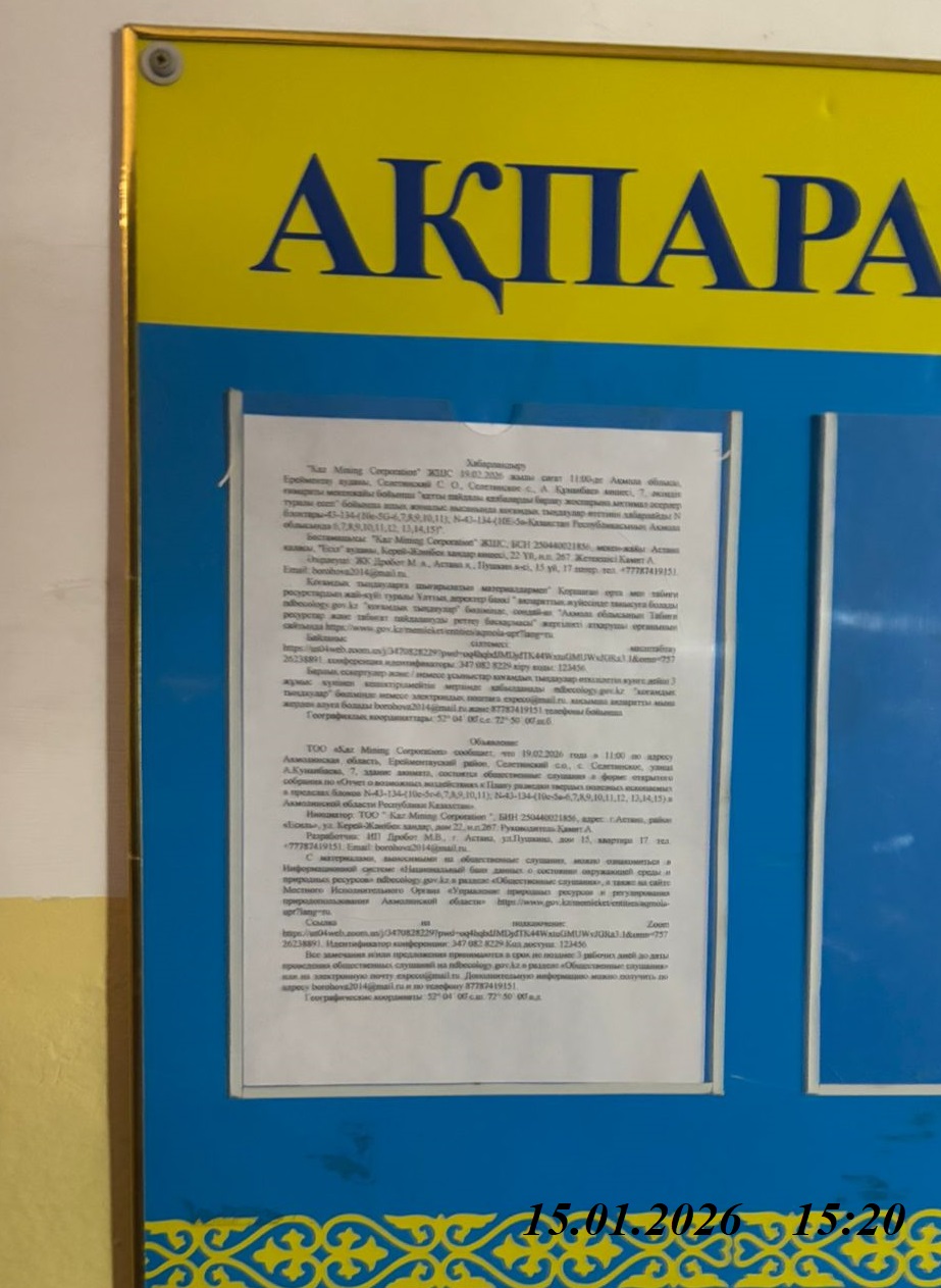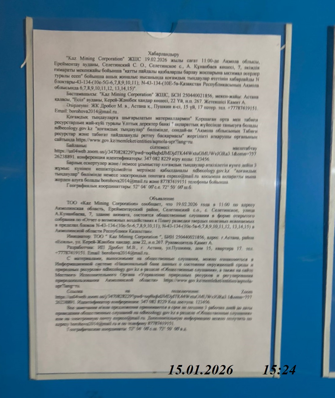 3. Общественные слушания организованны: Управление природных ресурсов и регулирования природопользования Акмолинской области, expeco@mail.ru,