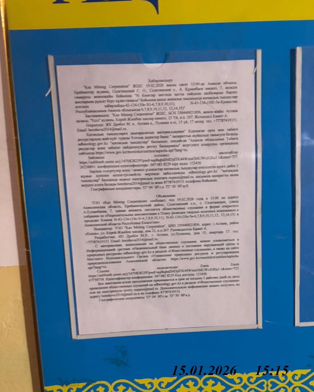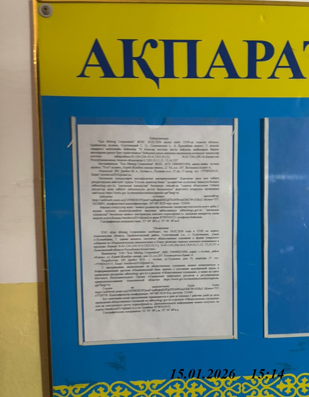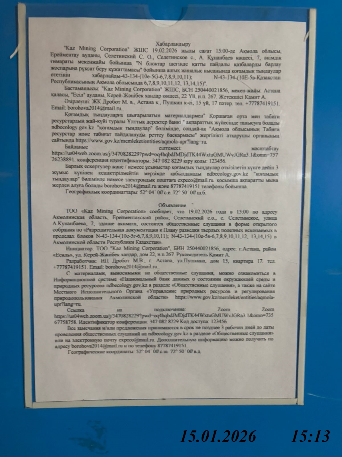 3. Общественные слушания организованны: Управление природных ресурсов и регулирования природопользования Акмолинской области, expeco@mail.ru,