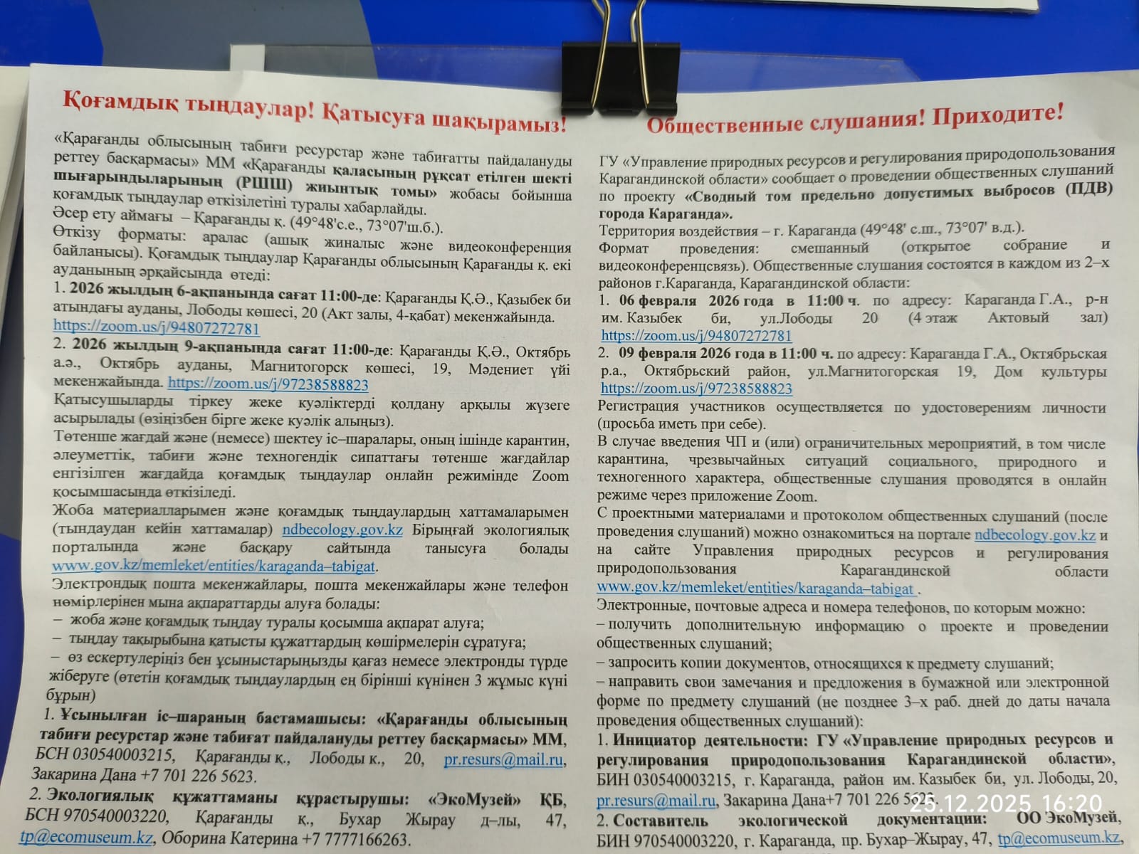 3. Общественные слушания организованны: Управление природных ресурсов и регулирования природопользования Карагандинской области, expertiza.upr_krg@mail.ru,