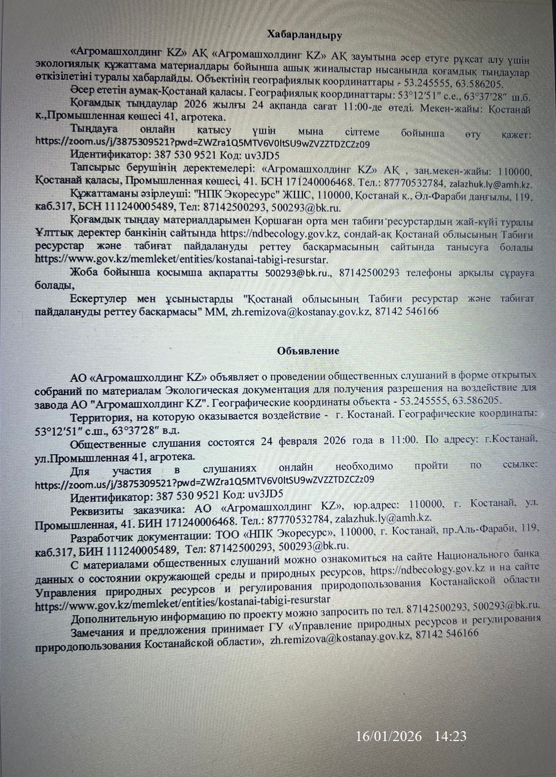 3. Общественные слушания организованны: Управление природных ресурсов и регулирования природопользования Костанайской области, zh.remizova@kostanay.gov.kz, 87142 546166,