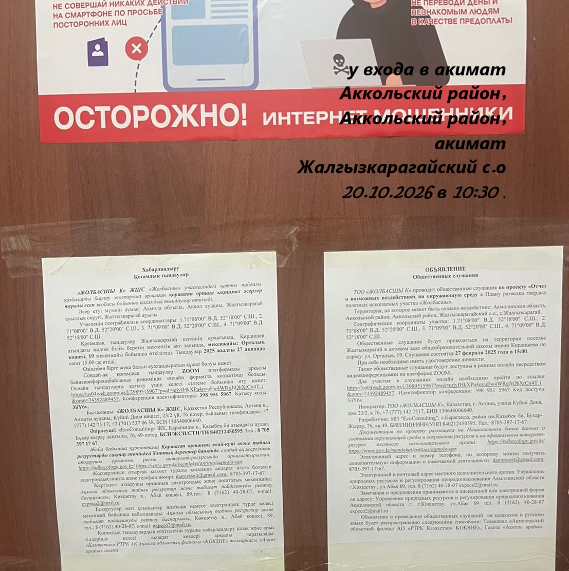 1.2. Место проведения: Акмолинская область, Аккольский район, Жалгызкарагайский сельский округ, с. Жалгызкарагай. Общественные слушания будут проводиться на территории села Жалгызкарагай, в актовом зале общеобразовательной школы имени Кирдищева, расположенной по адресу: ул. Орталык, 19, а также с возможностью участия посредством видеоконференции Zoom: https://us04web.zoom.us/j/3989515967?pwd=nrjyIHkXPa4oyuFw4WRgJtQbXrCx4T.1&omn=74392489457 Идентификатор конференции: 398 951 5967, код доступа: 3iiY6.v