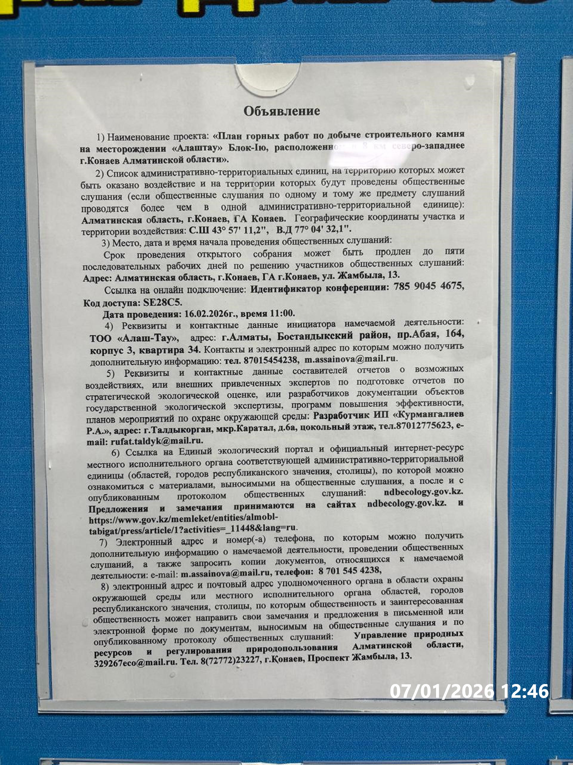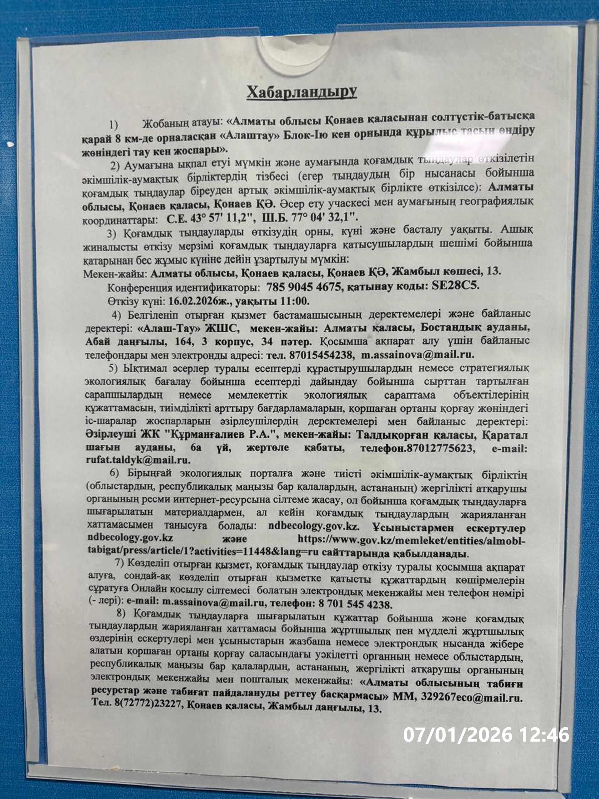 3. Общественные слушания организованны: Управление природных ресурсов и регулирования природопользования Алматинской области, 329267eco@mail.ru,