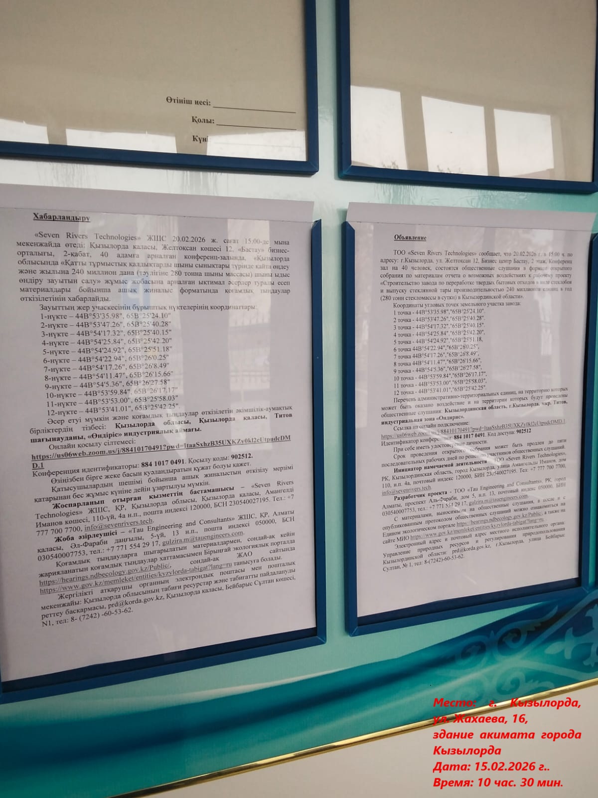 3. Общественные слушания организованны: Управление природных ресурсов и регулирования природопользования Кызылординской области, prd@korda.gov.kz 87242605362, 605369,