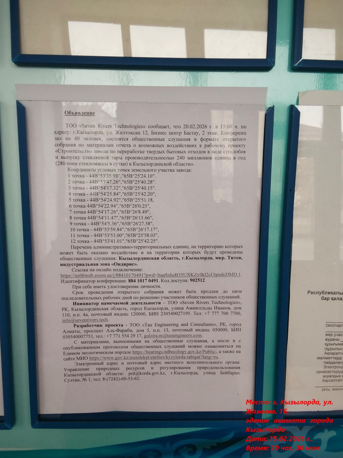 По проекту: Проект «Строительство завода по переработке твердых бытовых отходов в виде стеклобоя и выпуску стеклянной тары производительностью 240 миллионов единиц в год (280 тонн стекломассы в сутки) в Кызылординской области» ТОО «Seven Rivers Technologies».