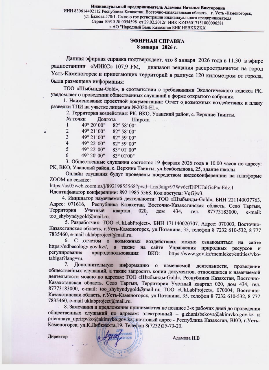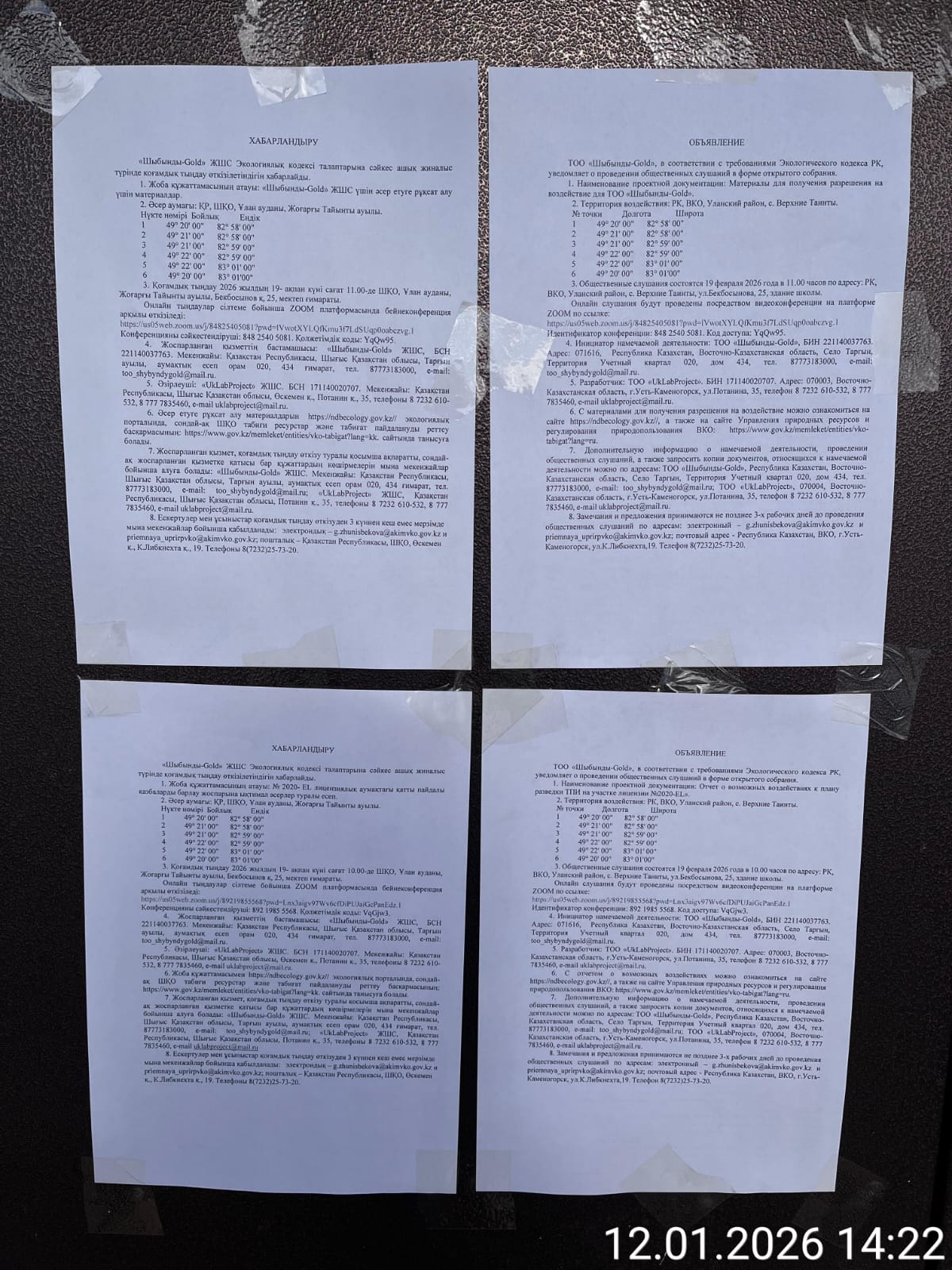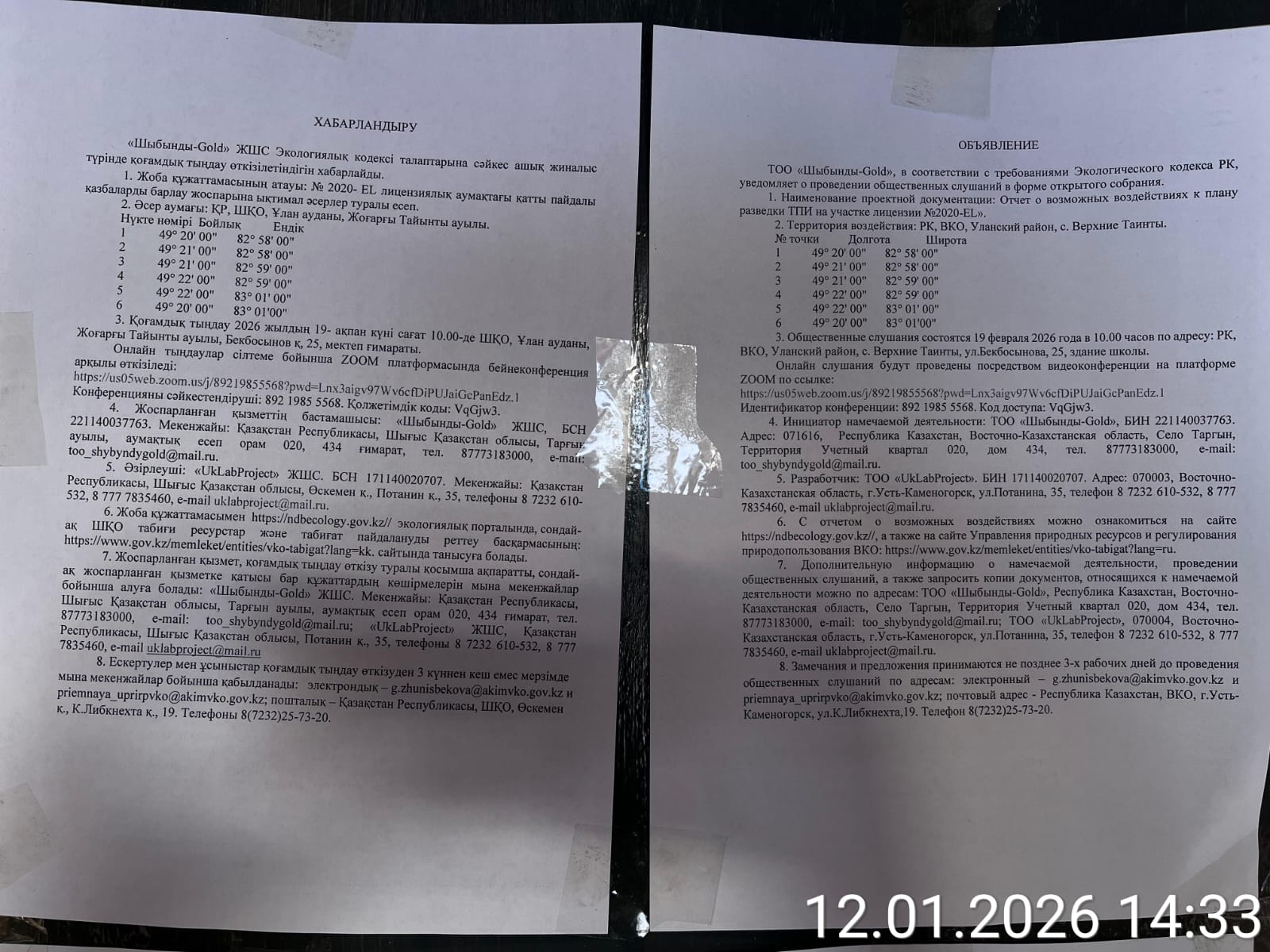 3. Общественные слушания организованны: Управление природных ресурсов и регулирования природопользования Восточно-Казахстанской области, g.zhunisbekova@akimvko.gov.kz,