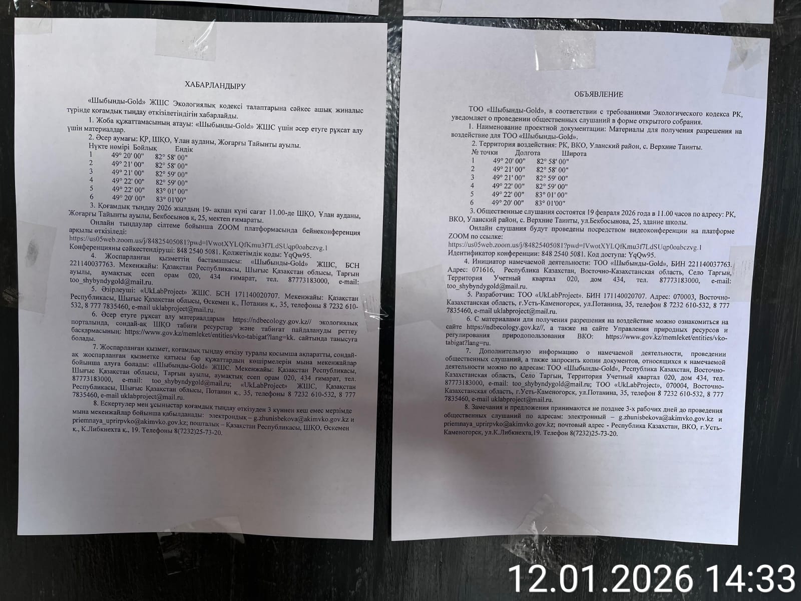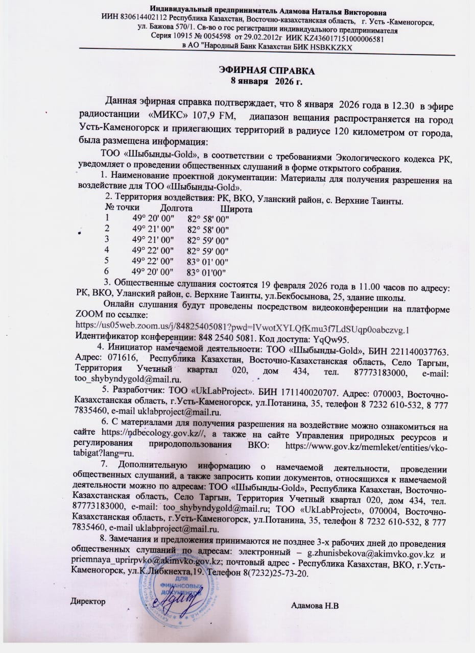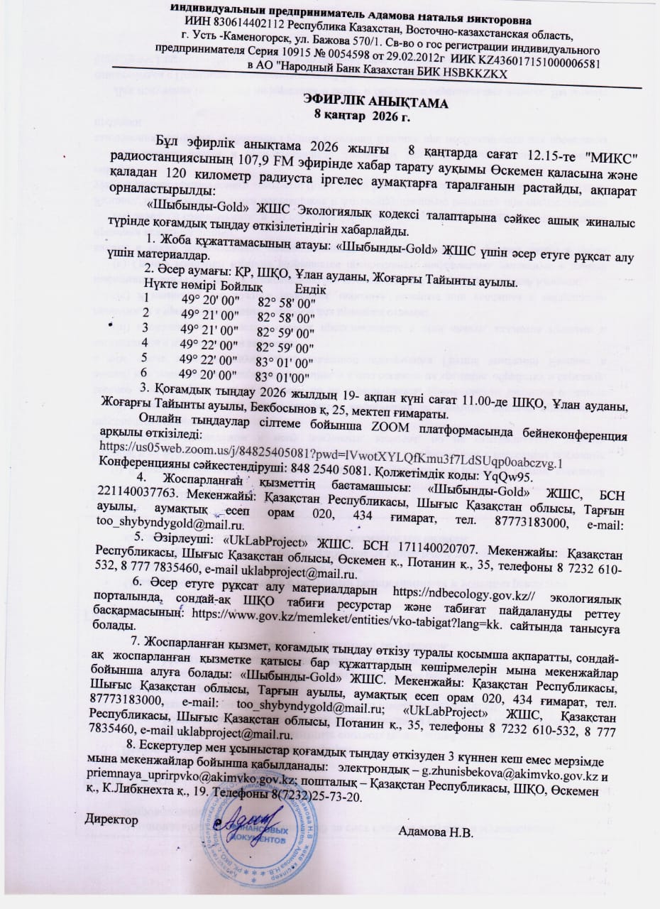 3. Общественные слушания организованны: Управление природных ресурсов и регулирования природопользования Восточно-Казахстанской области, g.zhunisbekova@akimvko.gov.kz,