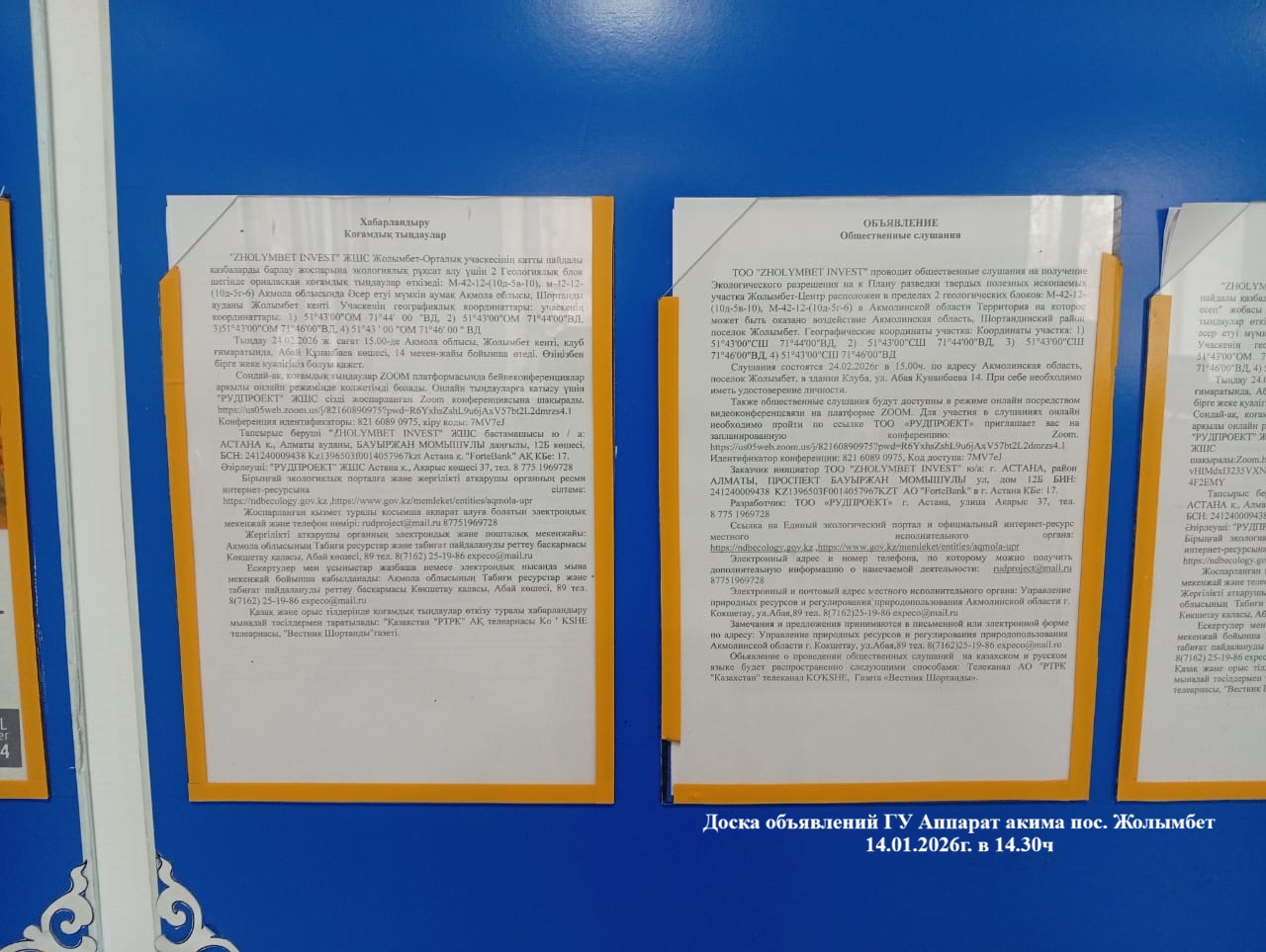 4. Повестка дня общественных слушаний: Лицензия 3646-ЕL-25.09.2025 года. Координаты участка: 1) 51°43'00"СШ 71°44'00"ВД, 2) 51°43'00"СШ 71°44'00"ВД, 3) 51°43'00" СШ 71°46'00"ВД, 4) 51°43'00"СШ 71°46'00"ВД. Участок разведки в соответствии с утвержденной Министром по инвестициям и развитию РК картой идентификации блоков с соответствующими координатами и индивидуальными кодами (приказ № 403 от 30 мая 2018 года) располагается на двух блоках, каждая сторона блока равна одной минуте в географической системе координат, с индивидуальными кодами: M-42-12-(10д-5в-10), M-42-12-(10д-5г-6). Площадь планируемого участка Жолымбет-Центр – 4,32 км2 (43,2 Га).В административном отношении лицензионный участок разведки Жолымбет-Центр располагается в границах Шортандинского района, вблизи поселка ( 200м) Жолымбет, Акмолинской области Республики Казахстан. Настоящим планом разведки предусматривается комплекс геологоразведочных работ, включающий в себя геологические маршруты, бурение скважин, горные работы (канавы и т.д), опробование, оценочное сопоставление исследований по определению масштаба оруденения с ранее выполненными геологоразведочными работами, на основе этих данных проведение более детальных геологоразведочных работ с последующим выявлением объектов, перспективных на промышленную добычу, и подсчет запасов полезных ископаемых по промышленным категориям: В, С1, С2; с определением параметров и показателей для проектирования и ведения промышленной добычи полезных ископаемых.