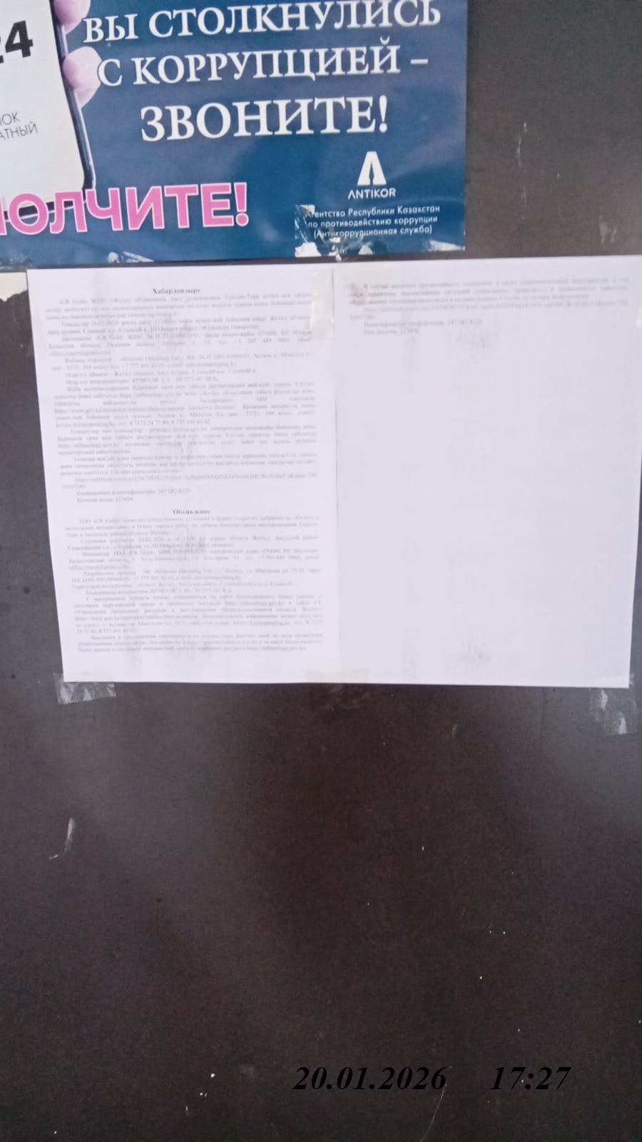 6. Объявление о проведении общественных слушаний на казахском и русском языках будет распространено следующими способами: