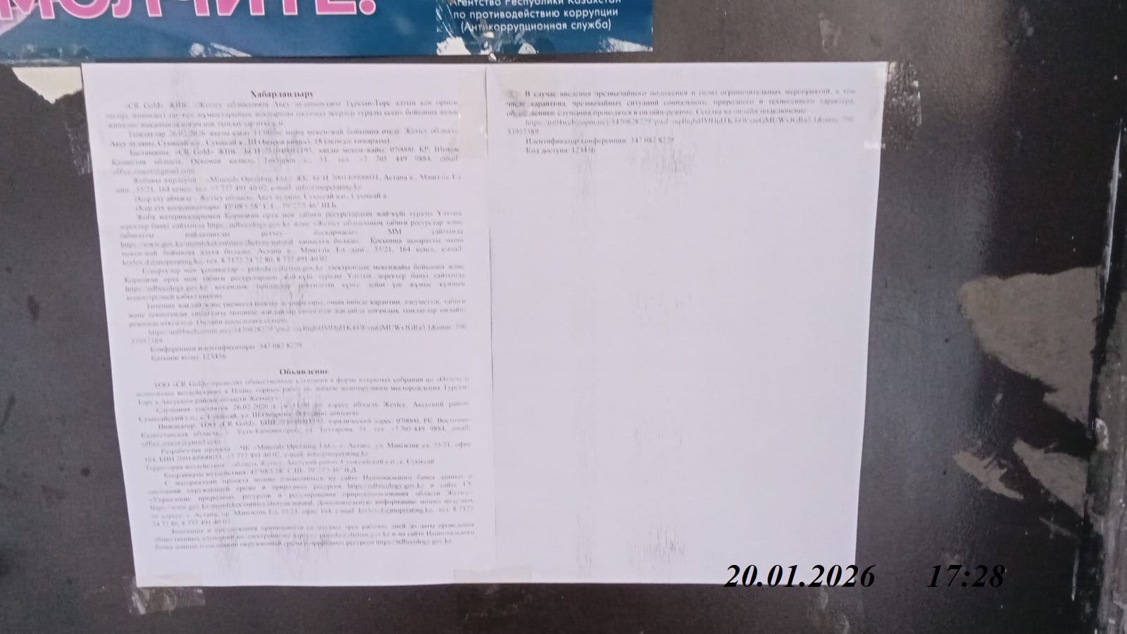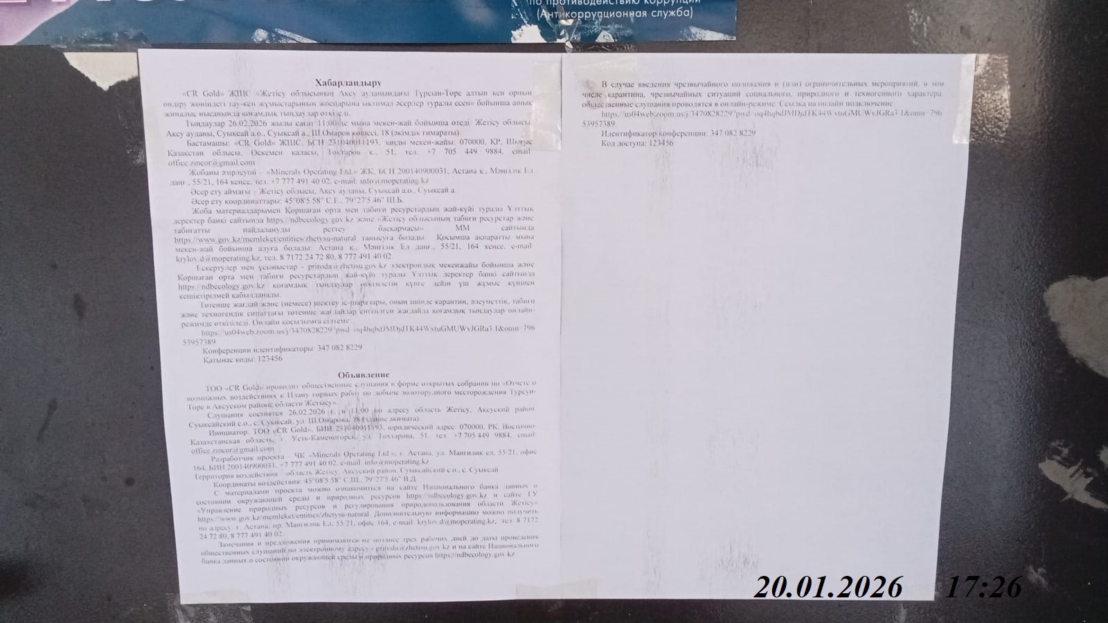 5.4. Дополнительная информация о административно-территориальных единиц: Ближайшим населенным пунктом является поселок Баласаз, входящий в Суыксайский сельский округ. В поселке Баласаз нет возможно сти провести слушания, поэтому они будут проведены в акимате села Суыксай, доставка жителей с поселка Баласаз будет обеспечена Инициатором намечаемой деятельности. Координаты угловых точек участка: 1. 45° 08' 5,58" N 79° 27' 5,46" E 2. 45° 08' 53,62" N 79° 27' 4,15" E, 3. 45° 08' 54,72" N 79° 28' 48,39" E, 4. 45° 08' 6,68" N 79° 28' 49,67" E. Время: 26 янв. 2026 11:00 PM. Подключиться к конференции Zoom https://us04web.zoom.us/j/3470828229?pwd=oq4hqbdJMDjdTK44WxtuGMUWvJGRa3.1&omn=79653957389. Идентификатор конференции: 347 082 8229. Код доступа: 123456