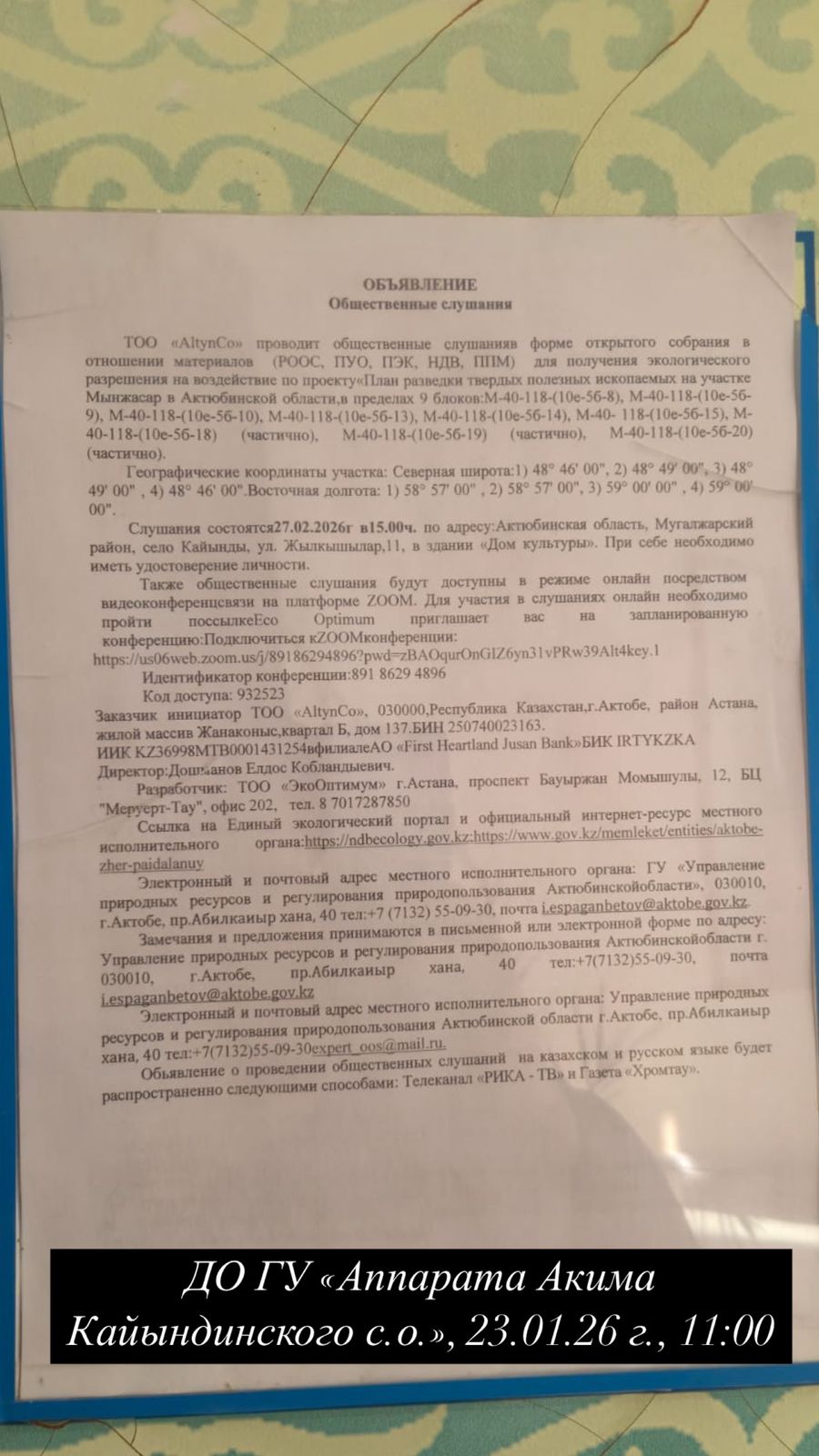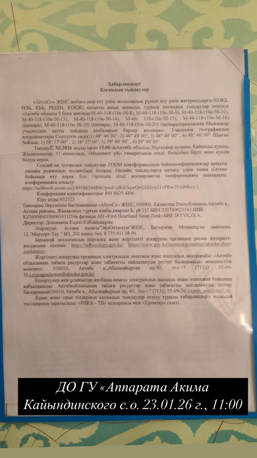 3. Общественные слушания организованны: Управление природных ресурсов и регулирования природопользования Актюбинской области, expert_oos@mail.ru,