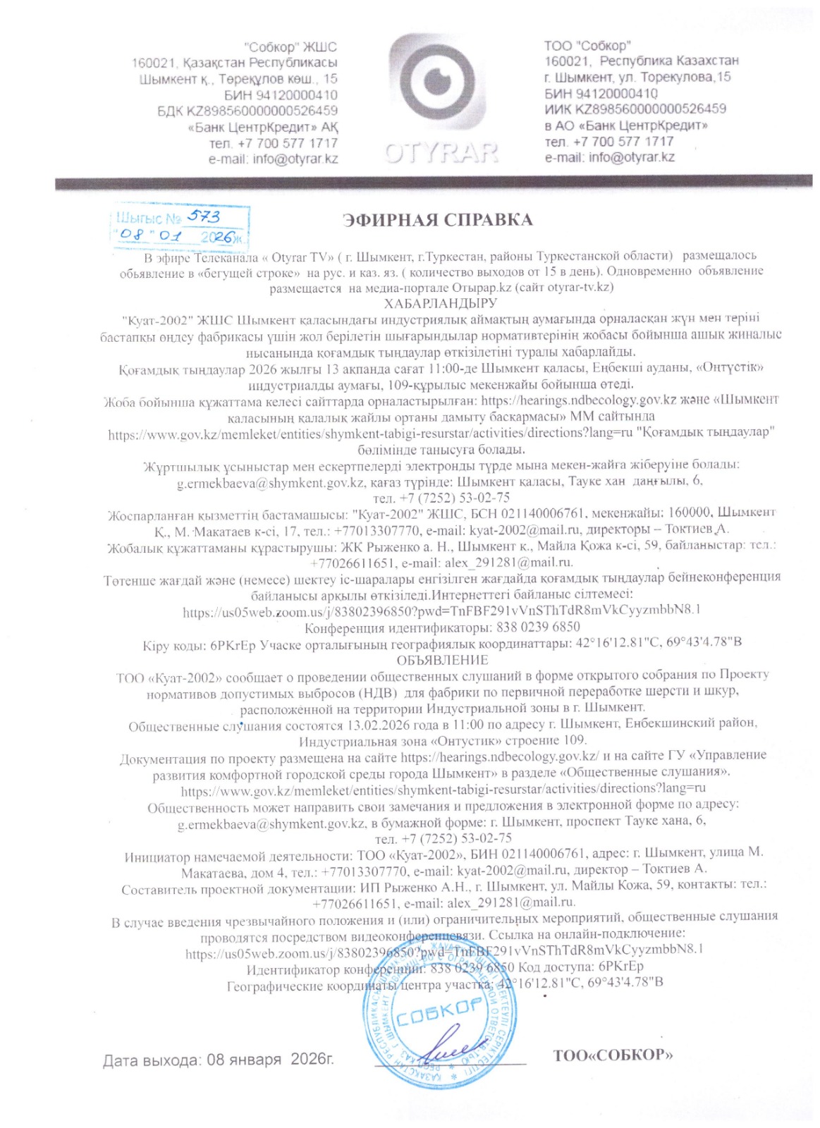 Подтверждающий документ о своевременном размещении объявления о проведении общественных слушаний не менее чем в одном теле- или радиоканале