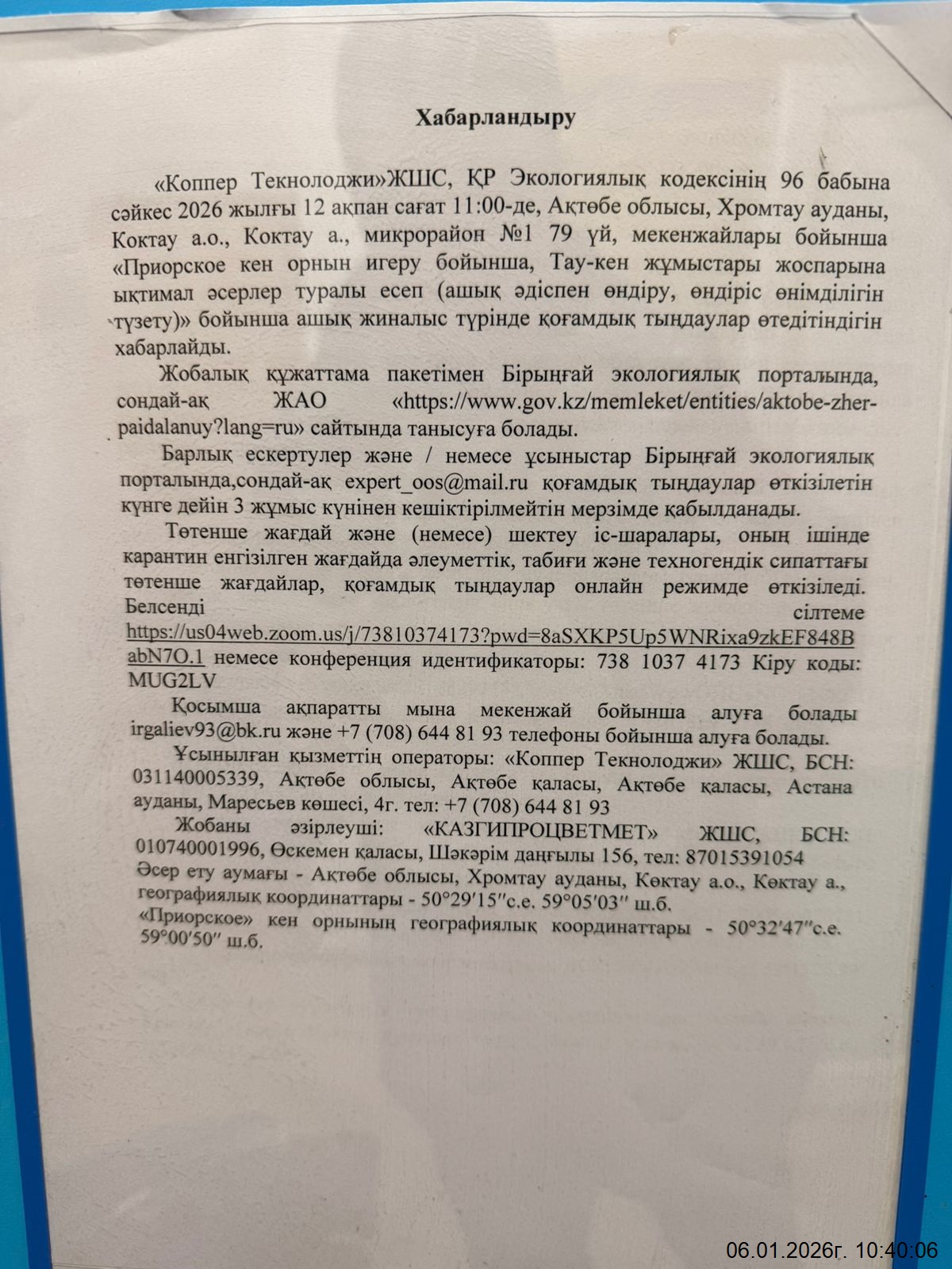 3. Общественные слушания организованны: Управление природных ресурсов и регулирования природопользования Актюбинской области, expert_oos@mail.ru,