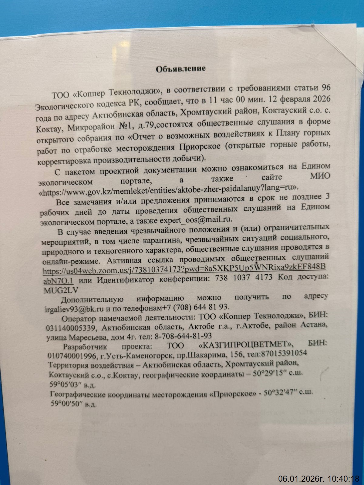 4. Повестка дня общественных слушаний: Географически медно-цинковое месторождение «Приорское» расположено в Северных Мугоджарах, на границе с Южным Уралом на правом берегу р. Орь в районе среднего ее течения. В административном отношении месторождение находится в Хромтауском районе Актюбинской области Республики Казахстан в 10 км северо-западнее месторождения «50 лет Октября» (пос. Коктау). Ближайшим от рудника крупным населенным пунктом является город Хромтау в 60 км на юго-запад, в котором расположен промышленный центр Донской ГОК. Областной центр, город Актюбинск, находится в 155 км (по прямой) на запад. В городе Актюбинске расположен международный аэропорт и железнодорожная станция пассажирского сообщения. В 14 км севернее месторождения проходит государственная граница Россия-Казахстан. Транспортная сеть района представлена железными и автомобильными дорогами. Ближайшие железнодорожные станции Министерства транспорта и коммуникаций Республики Казахстан – станции «Орь» и «Кимперсай». Станции расположены соответственно в 3 км юго-восточнее, и в 60 км юго-западнее от месторождения. В 4 км восточнее месторождения «Приорское» проходит магистральный газопровод. Ближайшими населенными пунктами от месторождения являются поселки Коктау, Майтобе и урочище Болатбугет. Гидрографическая сеть района представлена р. Орь, протекающей в 1,5 км юго-западнее месторождения. Намечаемая деятельность планируется на территории действующего месторождения «Приорское» в границах земельного отвода ТОО «Коппер Текнолоджи», который включает горный отвод, предоставленный ТОО «КопперТекнолоджи» для осуществления операций по недропользованию на месторождении «Приорское» 24 октября 2023 года № 1442-Д ТПИ. Горный отвод расположен в Актюбинской области. Общая площадь горного отвода в проекции на горизонтальную плоскость 1,181 км2. Глубина отработки – отметка минус 300 м. Срок права недропользования – Контракт на право недропользования рег. № 2251 от 29.12.2006 г. действует в течение 25 лет, начиная с момента вступления его в силу и истекает в последний день действия, то есть 29 декабря 2031 года. В соответствии с календарным графиком добычи - отработка месторождения заканчивается в 2047 году, необходимо продление Контракта до 2047 года включительно.