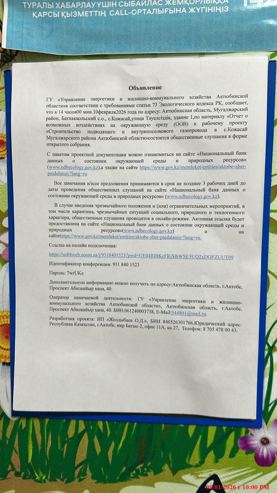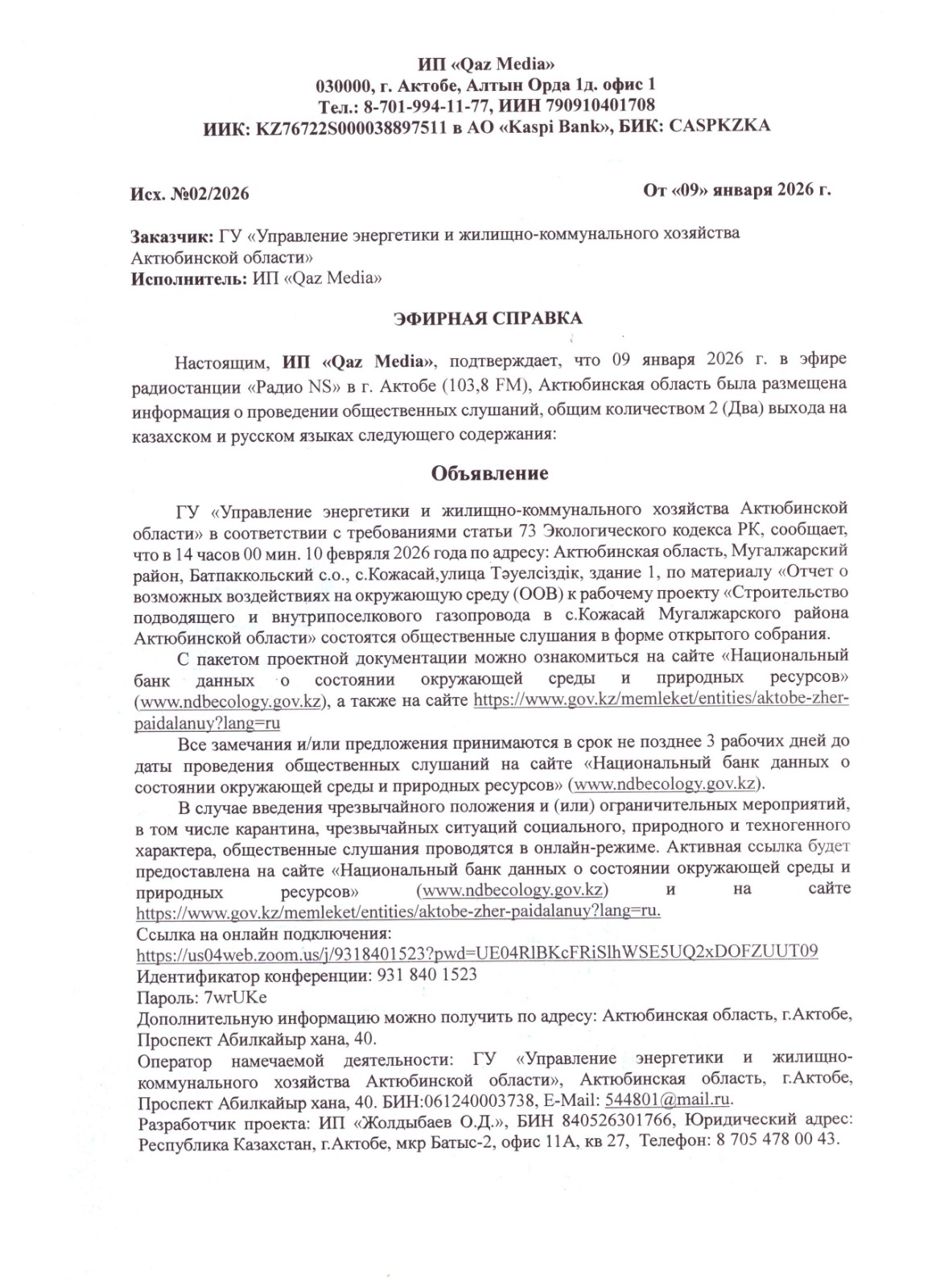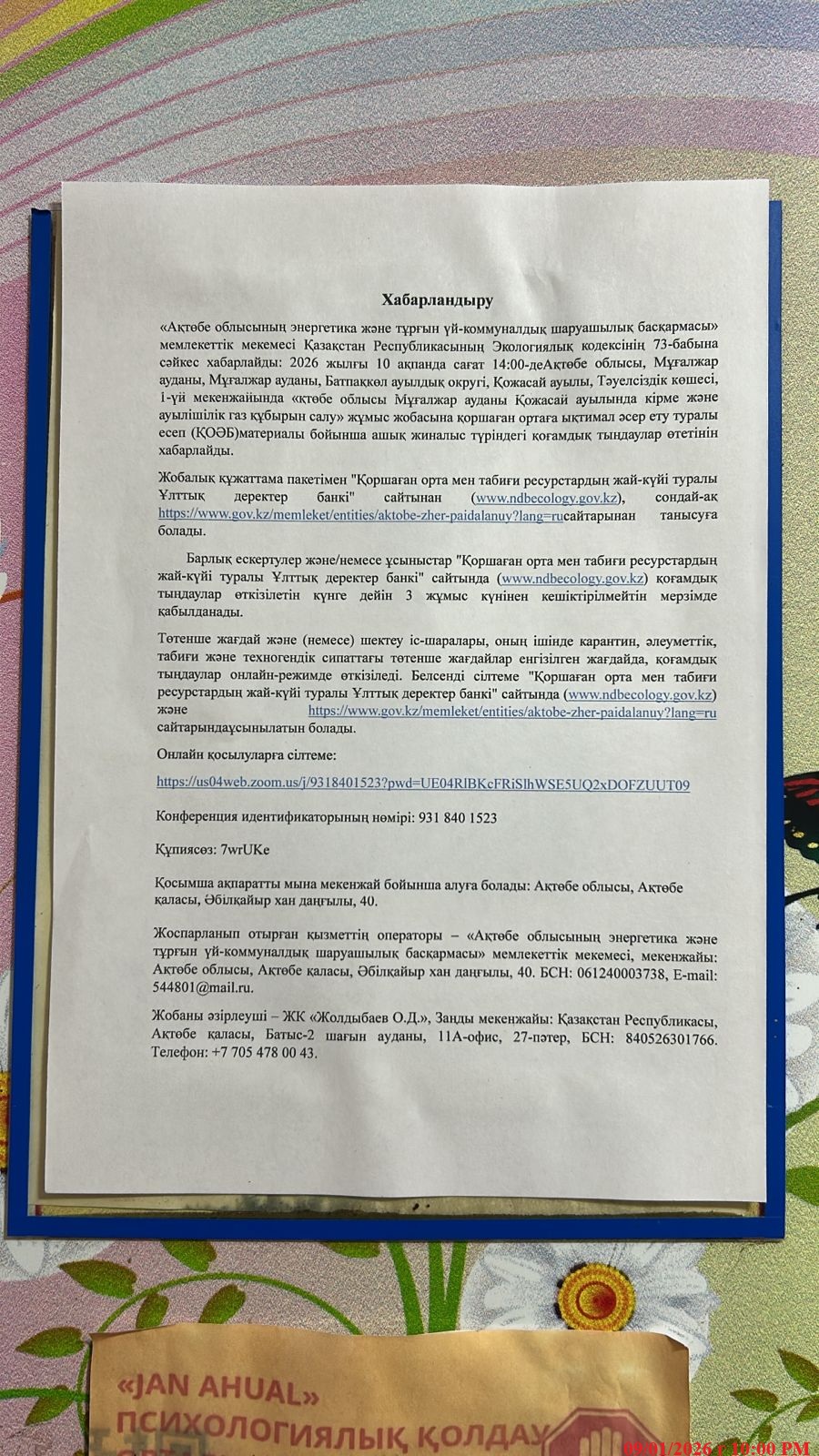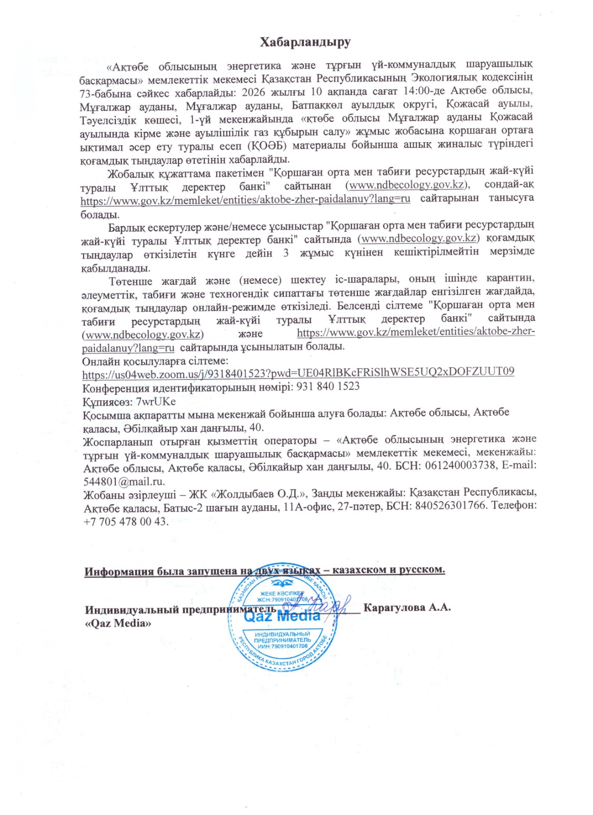 3. Общественные слушания организованны: Управление природных ресурсов и регулирования природопользования Актюбинской области, expert_oos@mail.ru,