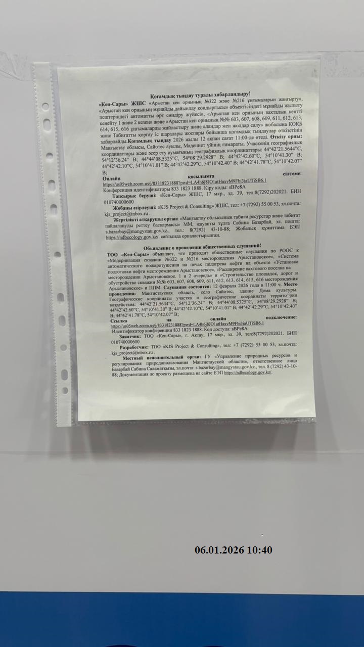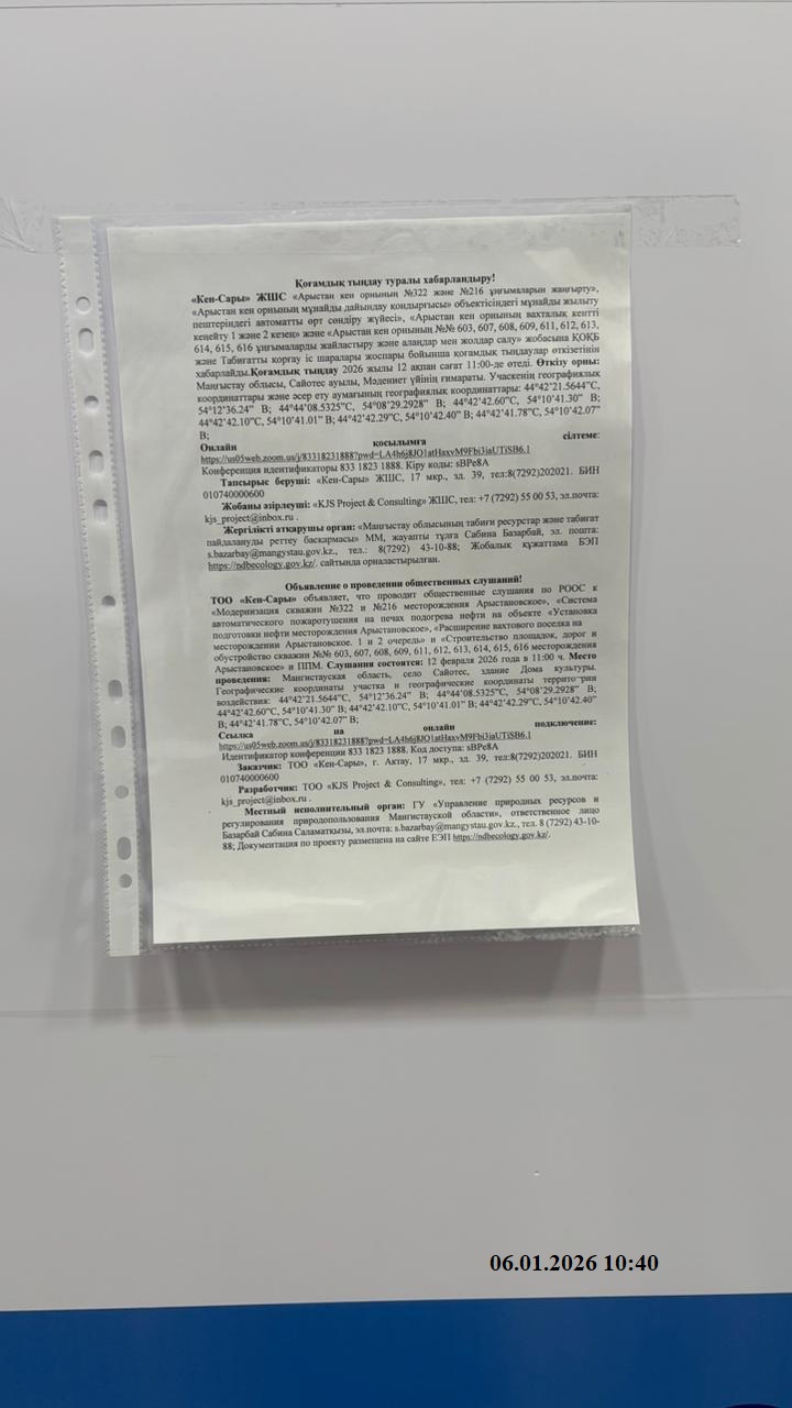 3. Общественные слушания организованны: Управление природных ресурсов и регулирования природопользования Мангистауской области, s.bazarbay@mangystau.gov.kz,