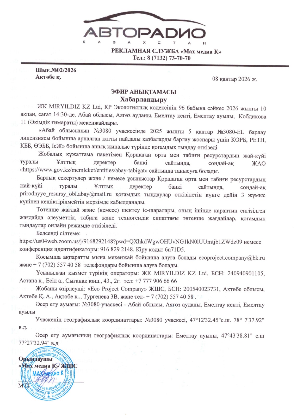 3. Общественные слушания организованны: Главный специалист УПР и ПР область Абай, prirodnyye_resursy_obl.abay@mail.ru,
