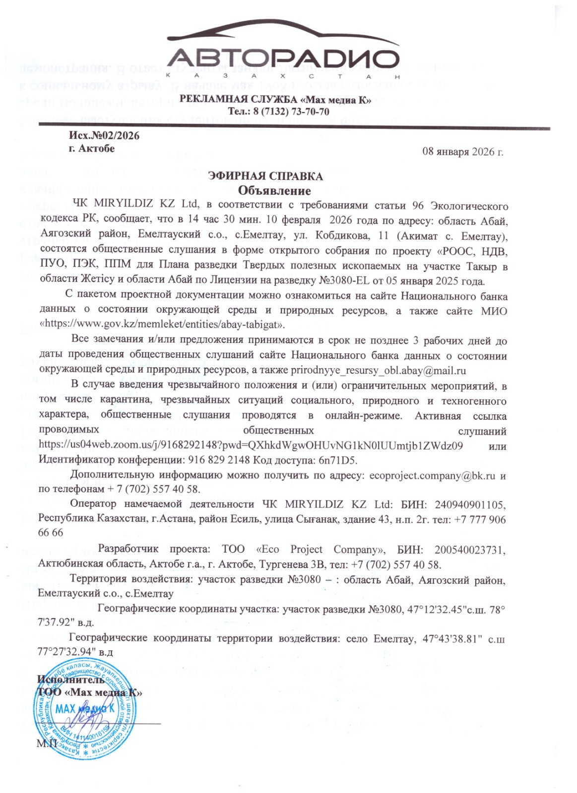 Подтверждающий документ о своевременном размещении объявления о проведении общественных слушаний не менее чем в одном теле- или радиоканале