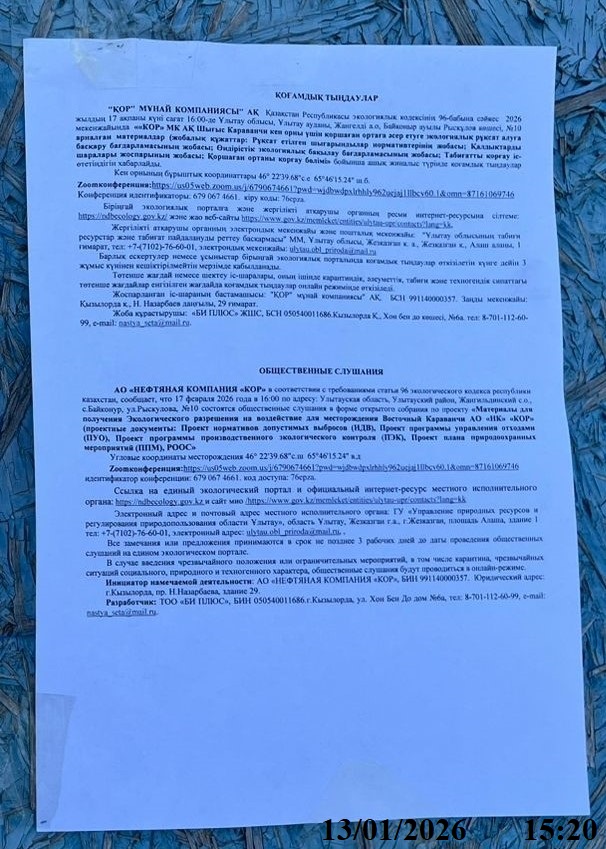 3. Общественные слушания организованны: Главный специалист УПР и ПР область Ұлытау, ulytau.obl_priroda@mail.ru,