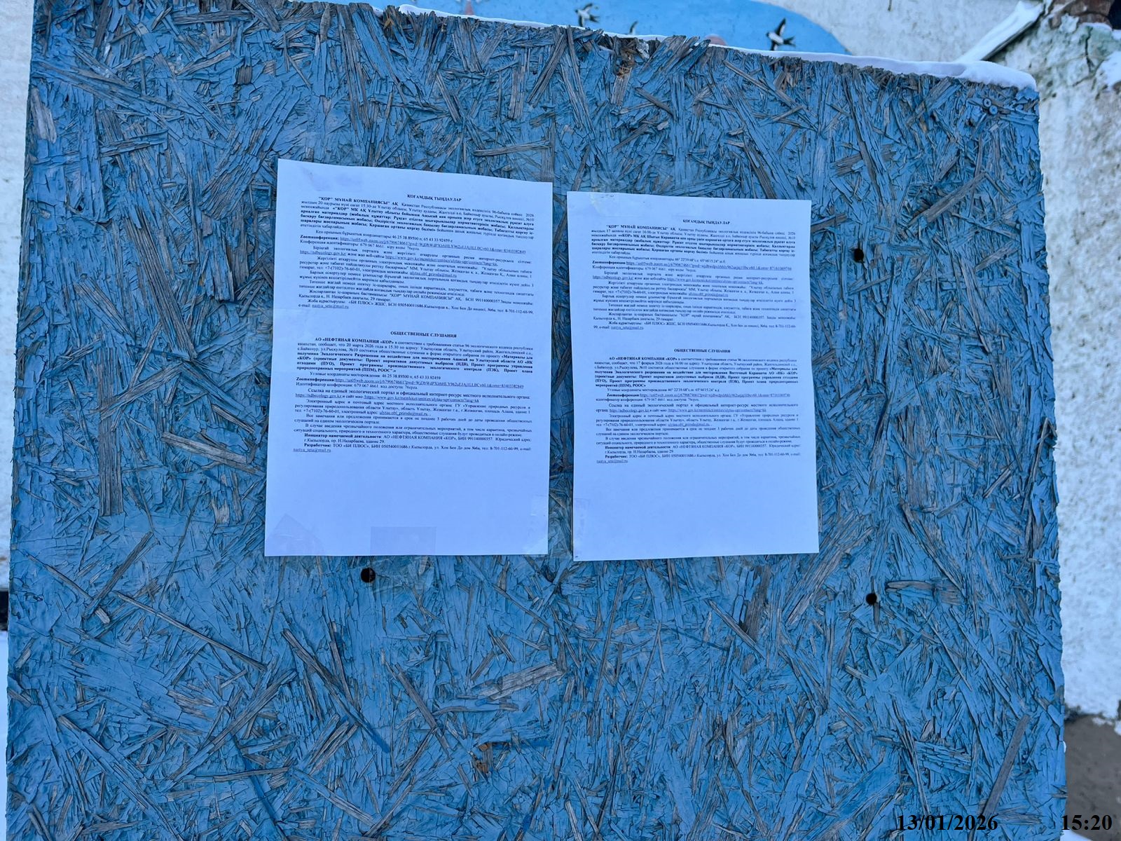 1.4. Описание для подключения к онлайн трансляции при прохождении общественного слушания: в соответствии с пп.4, п.11 прил. 3 Правил, информация о проведении общественных слушаний должна быть распространена на государственном и русском языках на досках объявлений местных исполнительных органов административно-территориальных единиц и в местах, специально предназначенных для размещения объявлений. В связи с чем необходимо дополнительно разместить печатные объявления на досках объявлений в акимате и в местах, специально предназначенных для размещения объявлений.