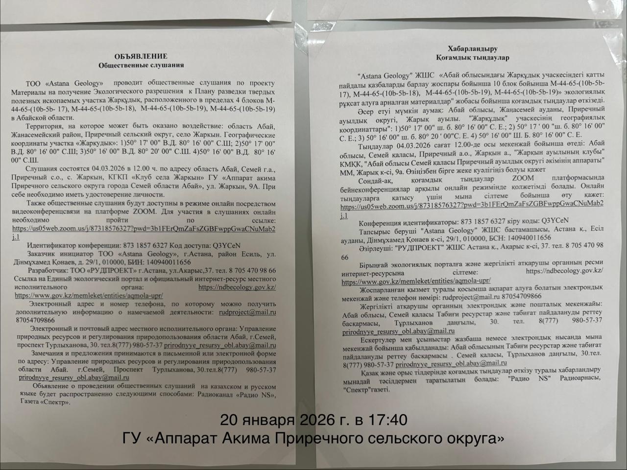 3. Общественные слушания организованны: Главный специалист УПР и ПР область Абай, prirodnyye_resursy_obl.abay@mail.ru,