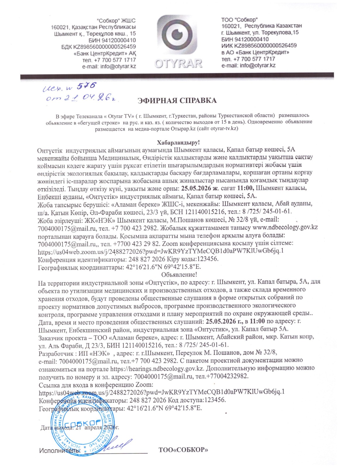 4. Повестка дня общественных слушаний: Настоящий проект нормативов допустимых выбросов для утилизации медицинских, производственных отходов и склада временного хранения отходов по адресу: г.Шымкента, улица Капал батыр, 5А, на территории индустриальной зоны «Онтустик». Как показали расчеты, выполненные в составе настоящего проекта при осуществлении планируемой деятельности, по всем выбрасываемым веществам, группам суммаций концентрации ни в одной расчетной точке не превышают ПДК (на границах области воздействия и границе жилой за-стройки). Результаты расчетов свидетельствуют о соблюдении гигиениче-ских стандартов качества атмосферного воздуха по всем веществам, выбра-сываемым источниками. Исходя из вышеизложенного и в соответствии с требованиями п. 8 «Методики определения нормативов эмиссий в окружающую среду» [3] эмиссии, осуществляемые при выполнении работ, предлагаются в качестве нормативов допустимых выбросов на каждый год деятельности. Вид намечаемой деятельности: Целью проекта является пересмотр (корректировка) ранее установ-ленных нормативов допустимых выбросов до истечения срока их действия по инициативе предприятия в связи с необходимостью учета новых пара-метров вновь введенных в эксплуатацию источников загрязнения атмосфе-ры (п.28 /2/). Классификация намечаемой деятельности в соответствии с Эколо-гическим кодексом РК [1]: Обьект относится к объектам II категории оказывающих негативное воздействие на окружающую среду соглано приложению 2 к Экологиче-скому кодексу Республики Казахстан от 2 января 2021 года № 400-VI ЗРК, раздел 2. п.6 пп 6.3 - объекты, на которых осуществляются операции по обезвреживанию опасных отходов, 6.4 - объекты, на которых осуществля-ются операции по обеззараживанию, обезвреживанию и (или) уничтожению биологических и медицинских отходов; Санитарная классификация: Санитарными правилами «Санитарно-эпидемиологические требова-ния к санитарно-защитным зонам объектов, являющихся объектами воздей-ствия на среду обитания и здоровье человека», утвержденным приказом Министра здравоохранения Республики Казахстан от 11 января 2023 года №ҚР ДСМ-2, обьекты по сжиганию медицинских отходов до 120 кг/час СЗЗ устанавливается 300 м. Потребность в разработке проекта возникла в связи с изменением па-раметров источников выбросов и добавлены ряд источников. Причины увеличение валовых выбросов: Согласно Разрешению на эмиссии загрязняющих веществ в атмосферу для оператора № KZ12VCZ03239975 от 17.05.2023г., объем выбросов со-ставлял 39,997 тонн. а выбросы согласно настоящему проекту ПДВ состав-ляют 58,344620445 т/год. Увеличение выбросов ЗВ на 18,3476 тн./год связано в связи с добав-лением новых источников - печа инсинератора ВЕСТА Плюс ПИР 1,0 К с горелкой и установка комплексной системы газоочистки Веста Плюс СГМ-01, дробилка пластика, пресс макулатуры и мусора. Объем производительность/заявки составляет 1226,4 тон., а выбросы согласно настоящему проекту ПНЭ составляют 58,34462 т/год. По результатам инвентаризации источников выбросов выполнено следующее: 1) источник №0005/001 Инсинератор ВЕСТА Плюс ПИР 1,0 К с горелкой добавлено в штатный режим/основной; 2) Добавлен неорганизованный ИЗВ 6004, 6005 – дробилка пла-стика, пресс макулатуры и мусора. По результатам проведения инвентаризации на предприятии загряз-няющие вещества будут поступать в атмосферу че