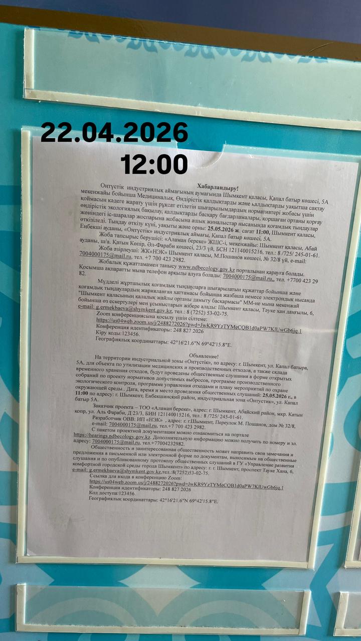 6.3. расположение мест, специально предназначенных для Размещения печатных объявлений (доски объявлений): г.Шымкента, Енбекшинский район,улица Капал батыр 5А, на территории индустриальной зоны «Онтустик»