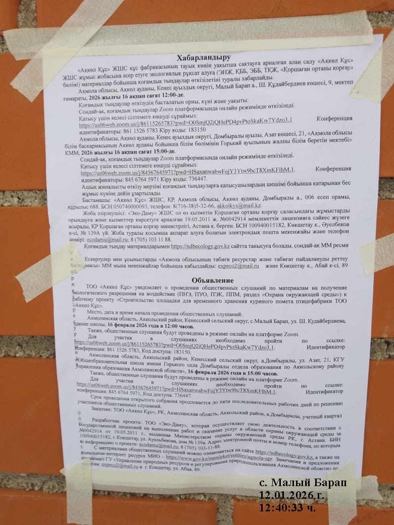 По проекту: В рамках получения экологического разрешения на воздействие (ПНЭ, ПУО, ПЭК, ППМ, раздел «Охрана окружающей среды») к рабочему проекту «Строительство площадки для временного хранения куриного помета птицефабрики ТОО «Акқөл Құс»».