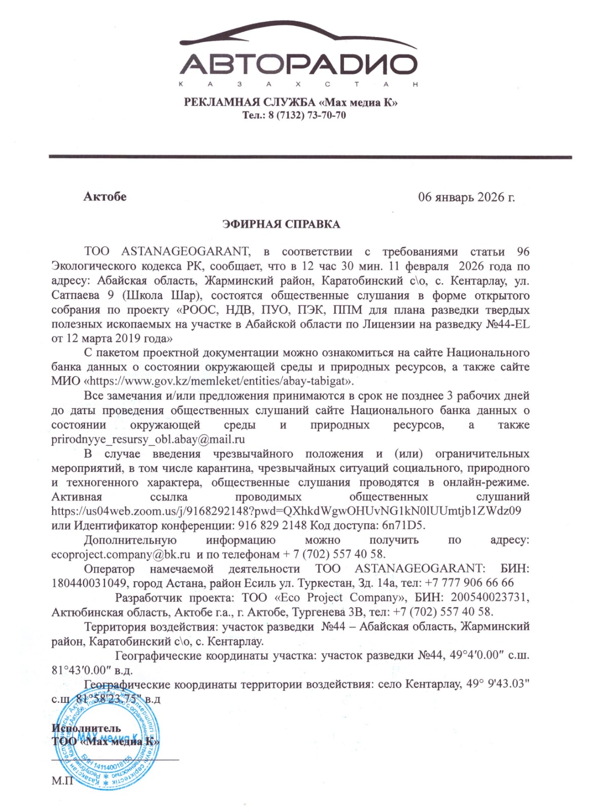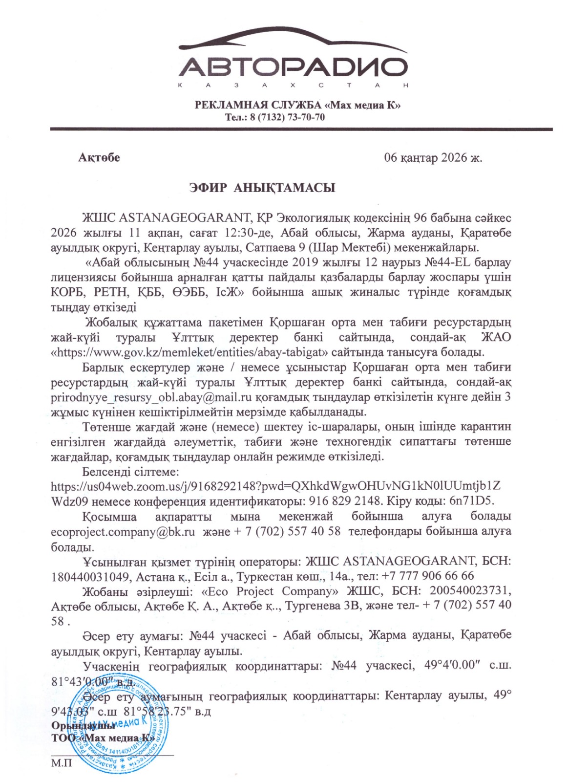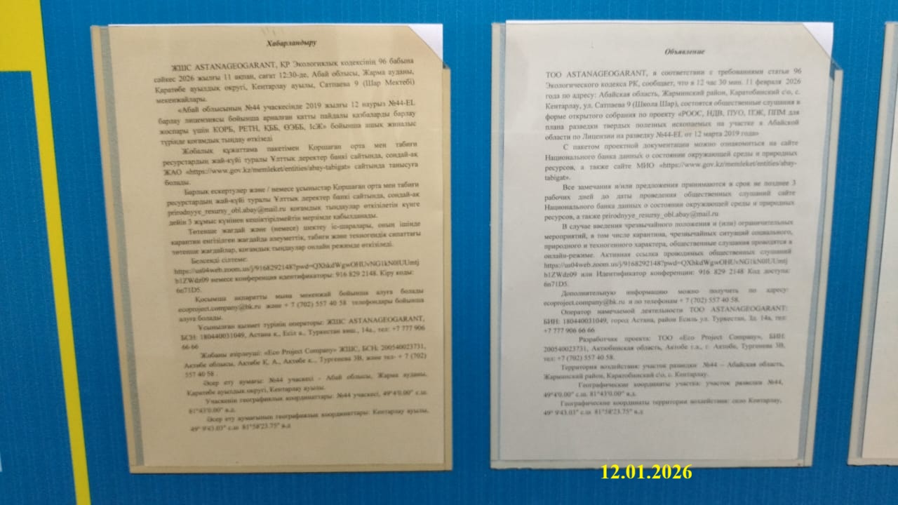 3. Общественные слушания организованны: Главный специалист УПР и ПР область Абай, prirodnyye_resursy_obl.abay@mail.ru,
