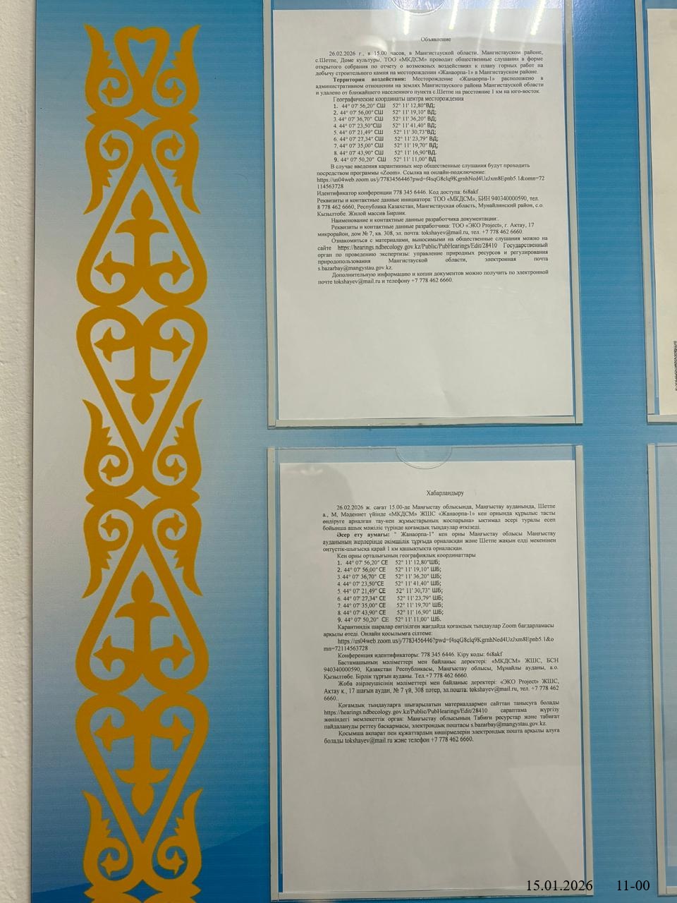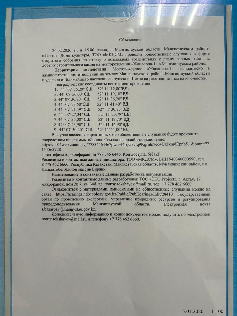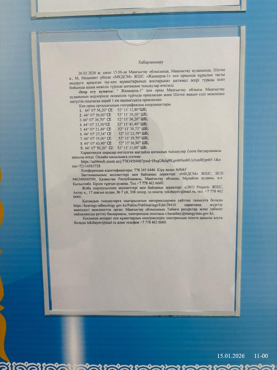 3. Общественные слушания организованны: Управление природных ресурсов и регулирования природопользования Мангистауской области, s.bazarbay@mangystau.gov.kz,