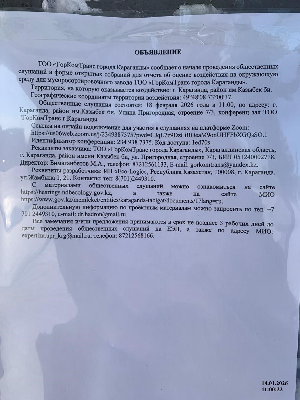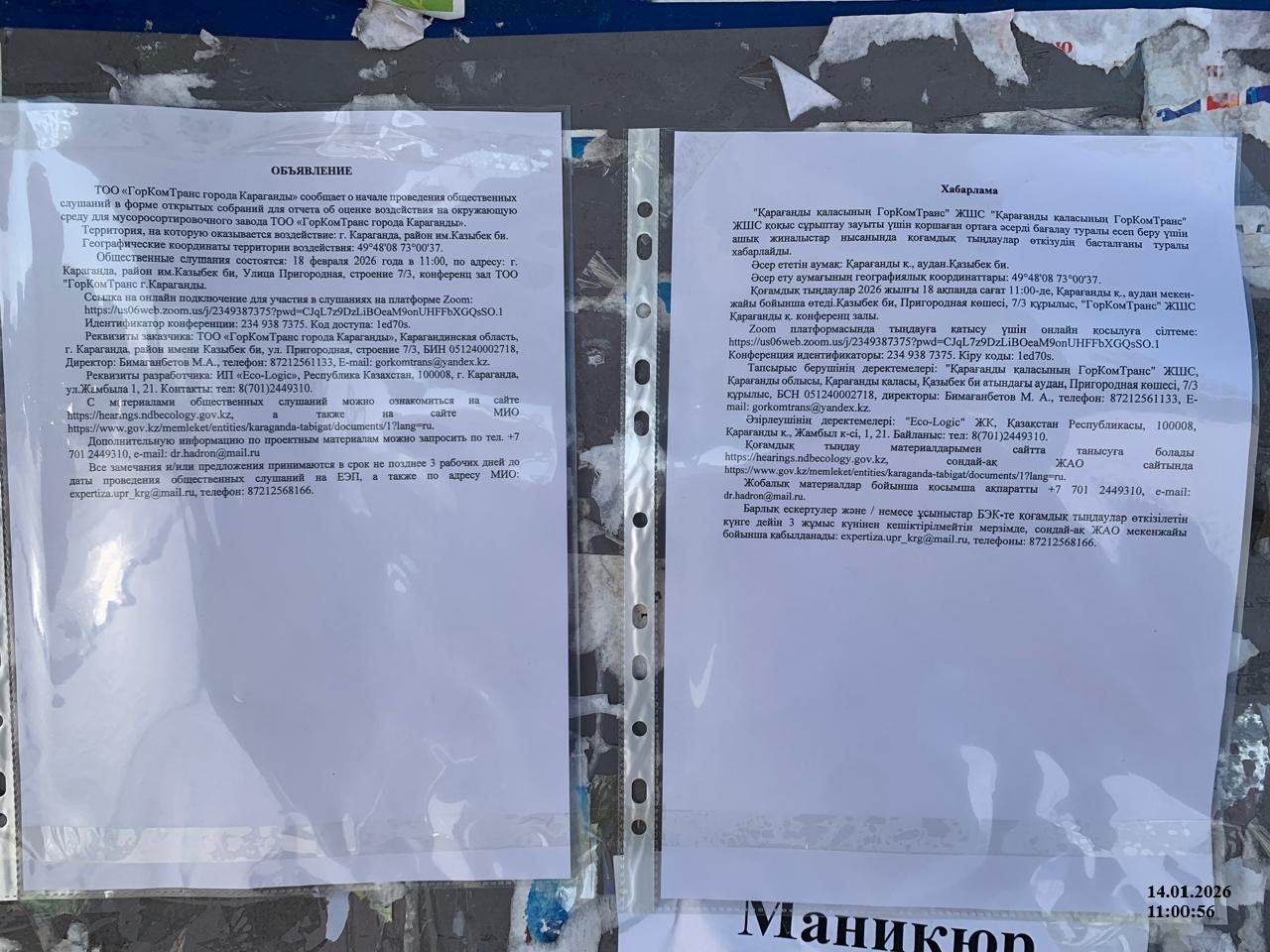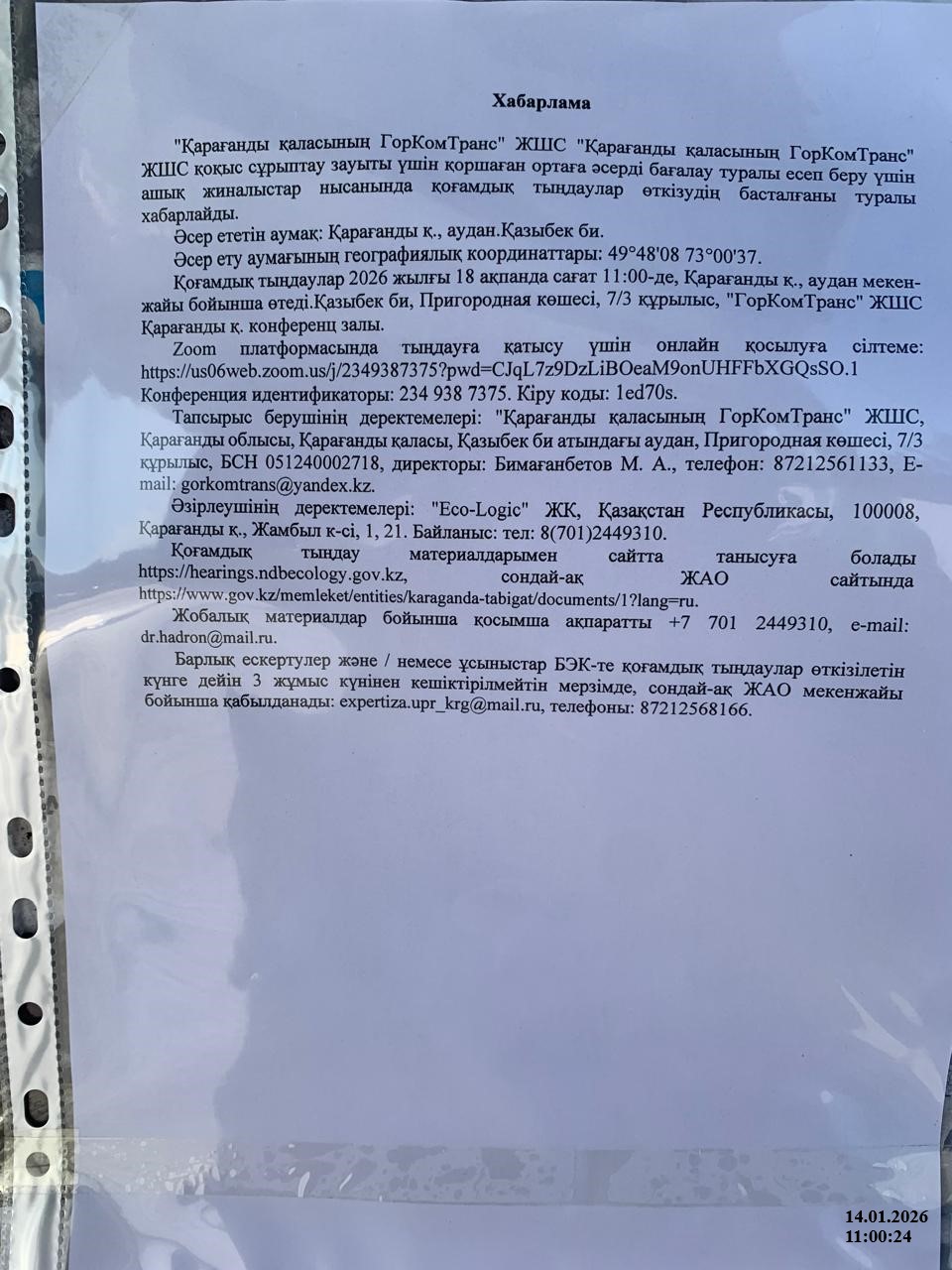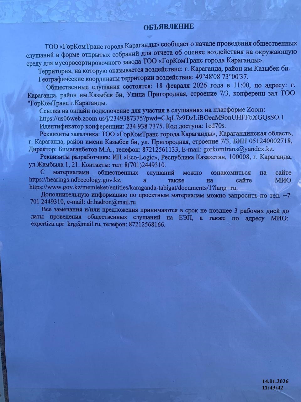 3. Общественные слушания организованны: Управление природных ресурсов и регулирования природопользования Карагандинской области, expertiza.upr_krg@mail.ru,