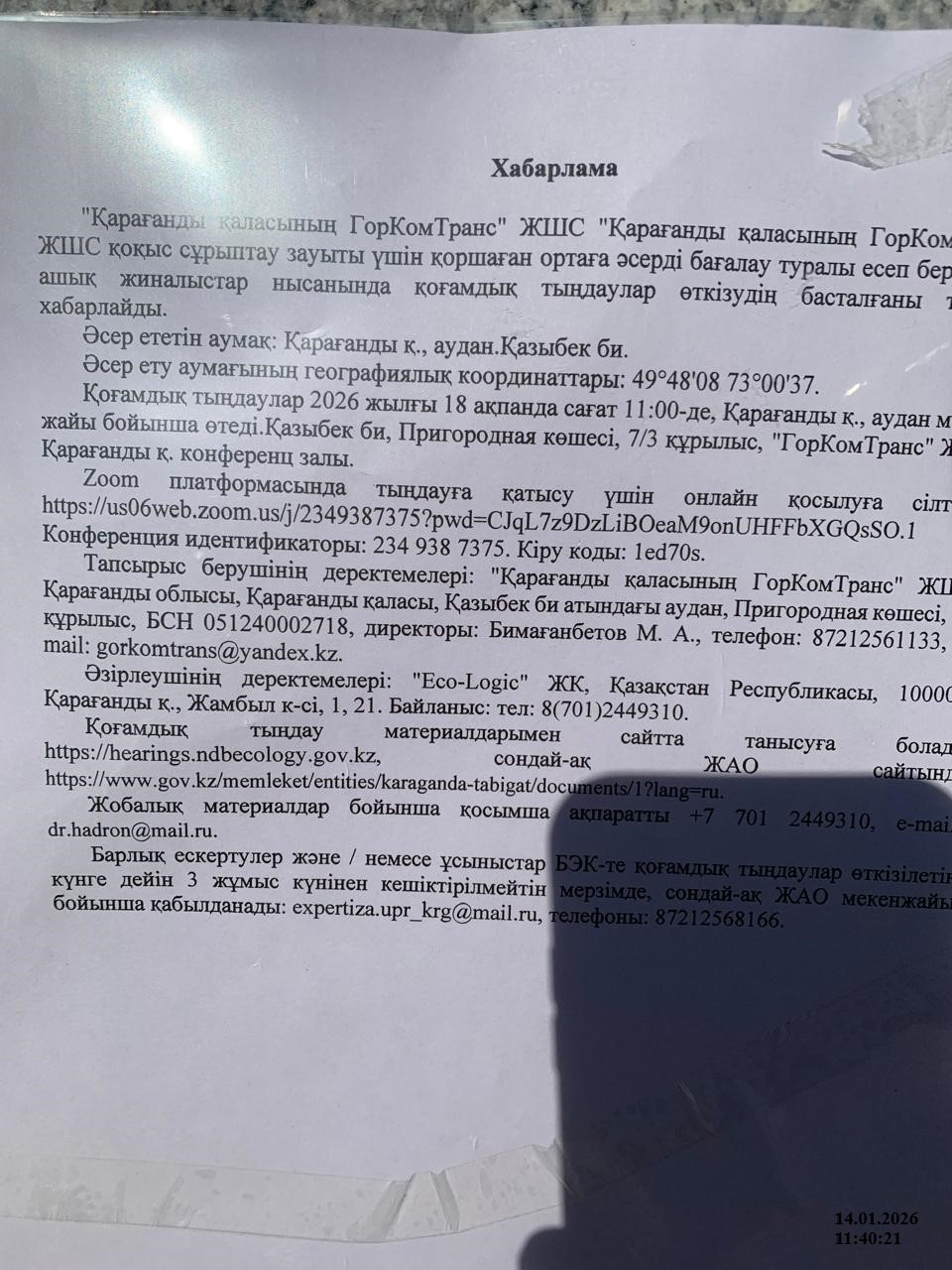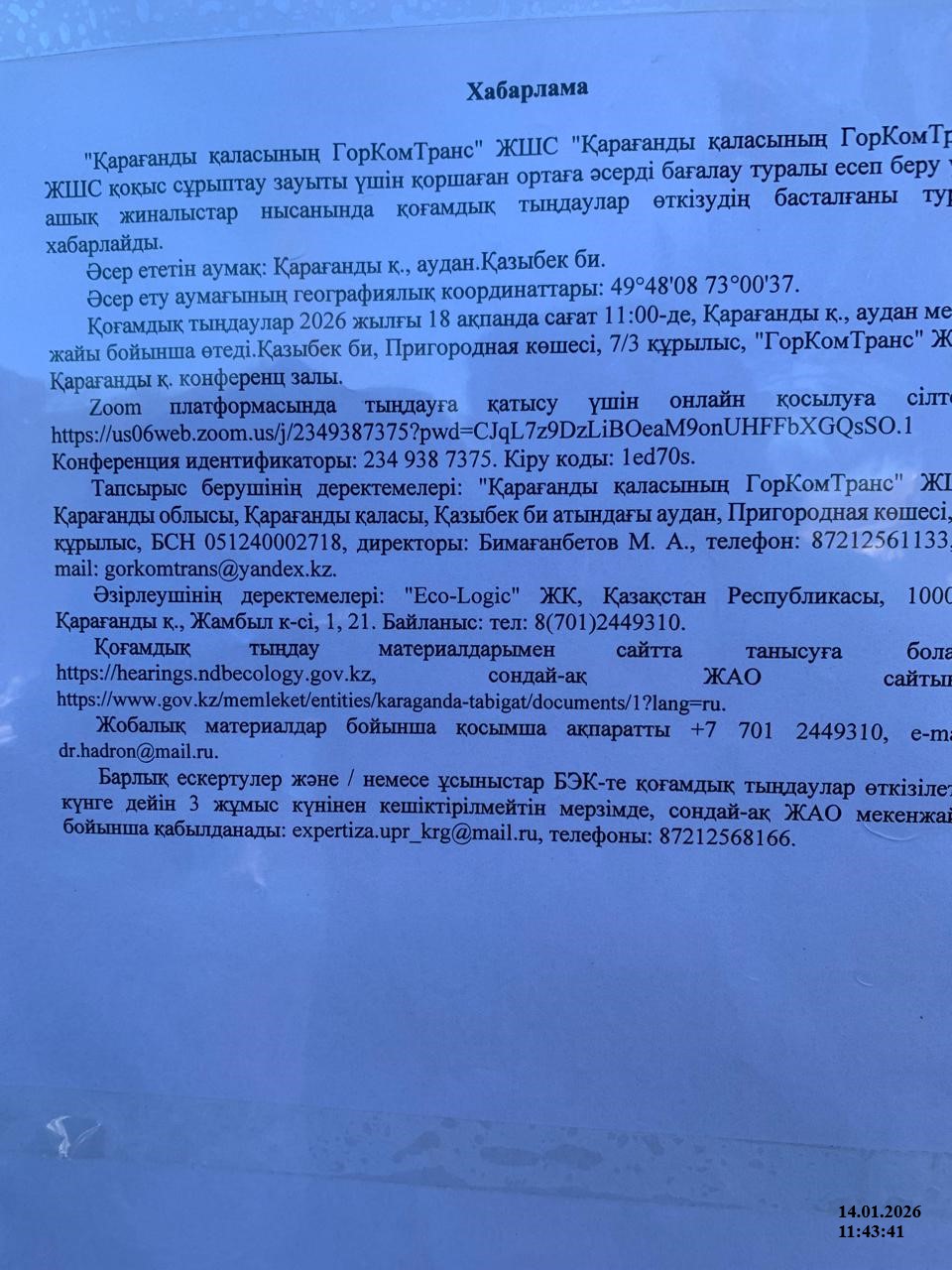 1.2. Место проведения: Карагандинская область, Караганда Г.А., район им.Казыбек би, Улица Пригородная, ст7/3, конференц зал ТОО "ГорКомТранс г. Караганды" . Участие онлайн: ZOOM:https://us06web.zoom.us/j/2349387375?pwd=CJqL7z9DzLiBOeaM9onUHFFbXGQsSO.1 Идентификатор конференции: 234 938 7375. Код доступа: 1ed70s.