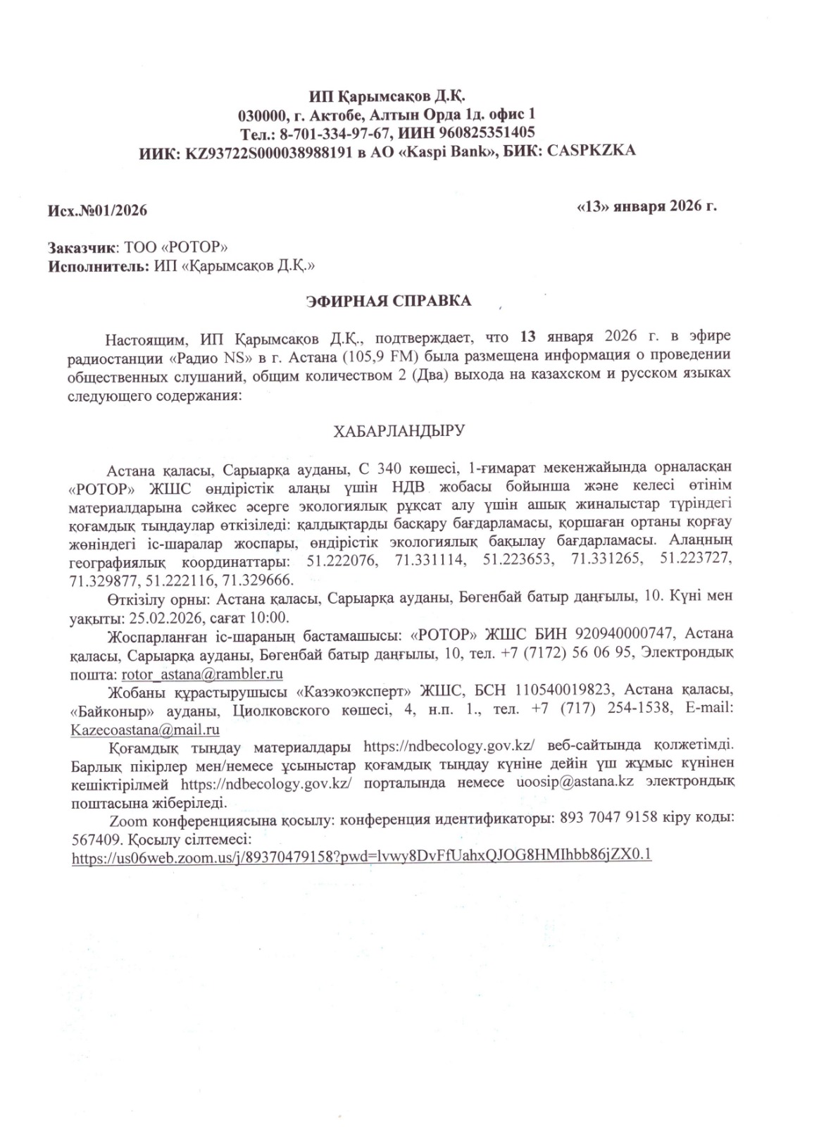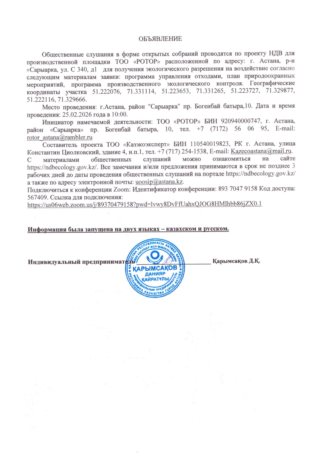 1.4. Описание для подключения к онлайн трансляции при прохождении общественного слушания: Тема: Товарищество с ограниченной ответственностью ""Ротор"" Время: 25 февр. 2026 10:00 Астана, Алматы Подключиться к конференции Zoom https://us06web.zoom.us/j/89370479158?pwd=lvwy8DvFfUahxQJOG8HMIhbb86jZX0.1 Идентификатор конференции: 893 7047 9158 Код доступа: 567409
