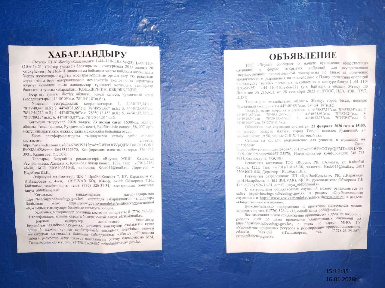 3. Общественные слушания организованны: Главный специалист УПР и ПР Жетысуйской области, priroda@zhetisu.gov.kz,