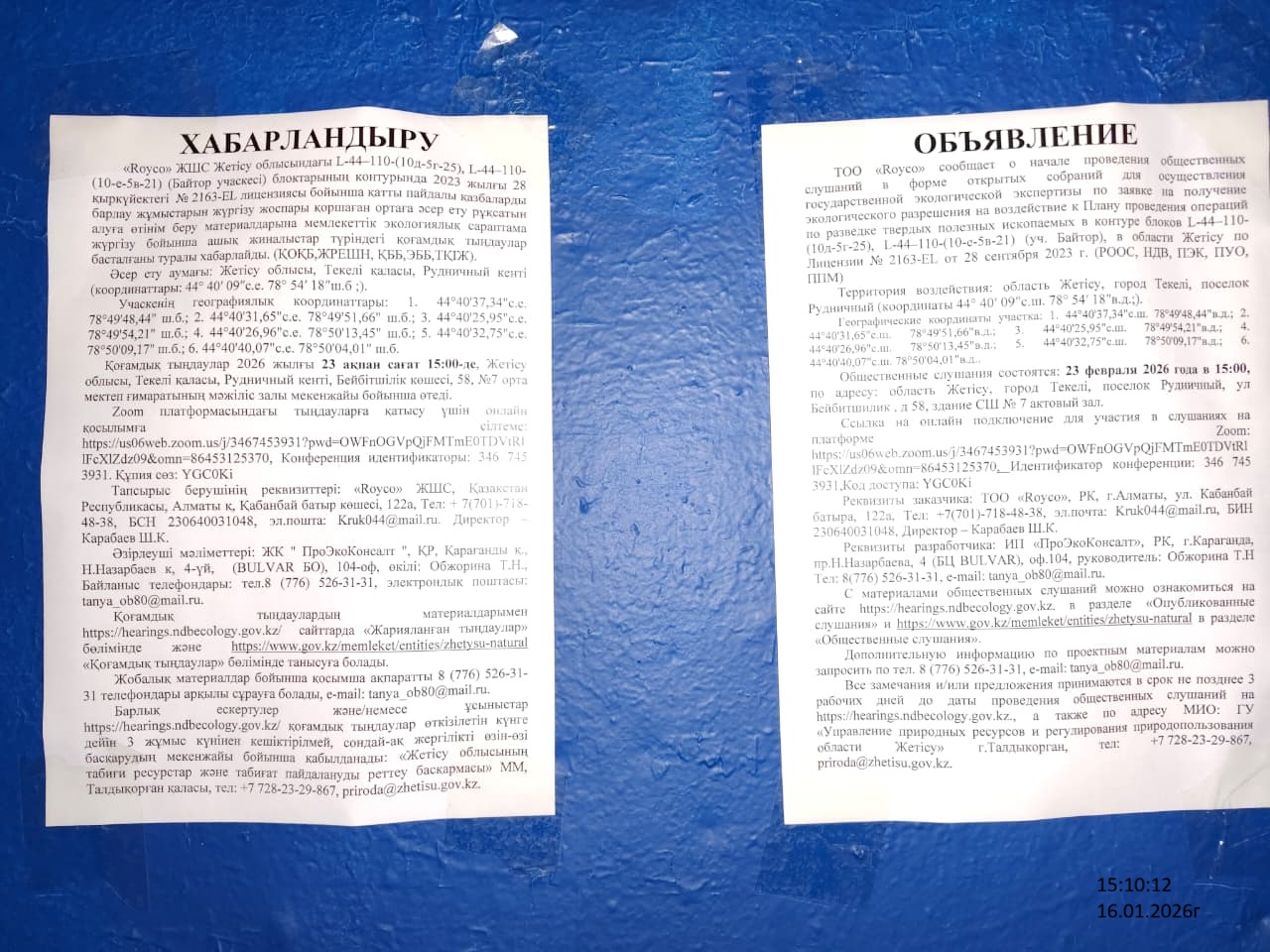 1.2. Место проведения: область Жетісу, город Текелі, поселок Рудничный, ул Бейбитшилик , д 58, здание СШ № 7 актовый зал. Ссылка на онлайн подключение для участия в слушаниях на платформе Zoom: https://us06web.zoom.us/j/3467453931?pwd=OWFnOGVpQjFMTmE0TDVtRllFcXlZdz09&omn=86453125370, Идентификатор конференции: 346 745 3931,Код доступа: YGC0Ki