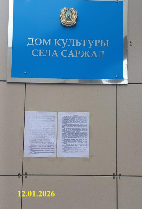 6.3. расположение мест, специально предназначенных для Размещения печатных объявлений (доски объявлений): область Абай, Абайский район, Сарыжалский с.о., с.Сарыжал, Кәбер Қайырханов 14 (Мәдениет үйі)