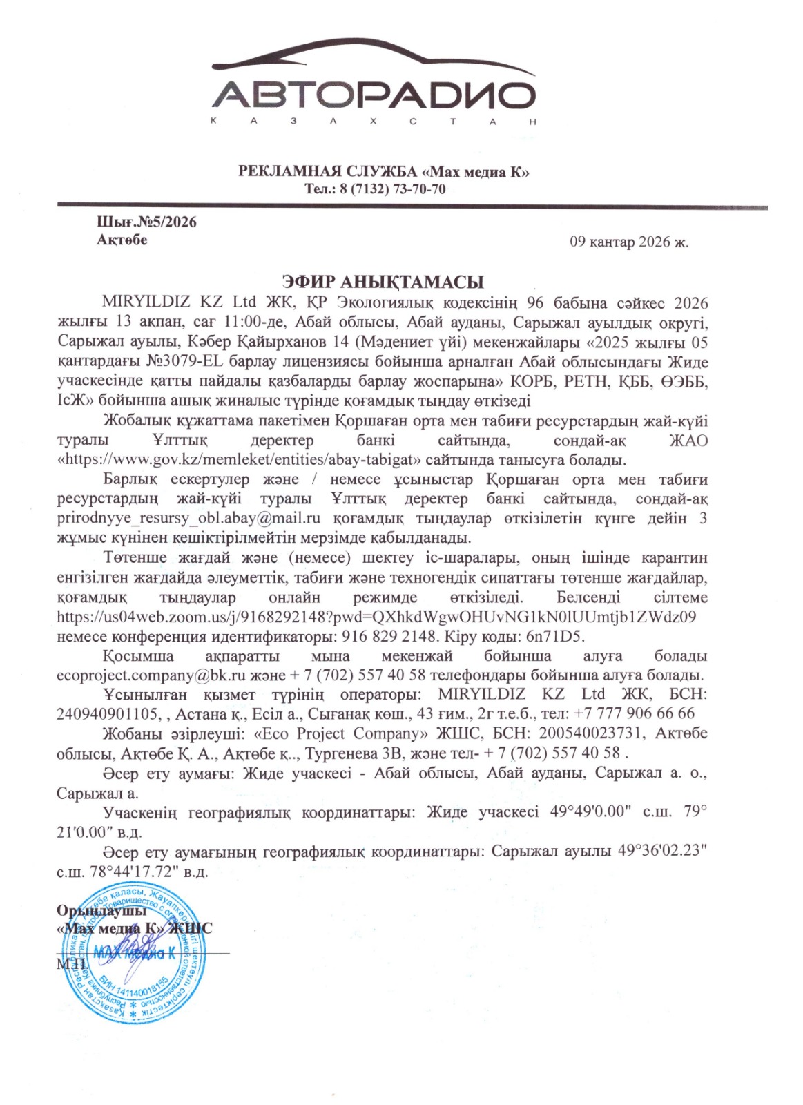 3. Общественные слушания организованны: Главный специалист УПР и ПР область Абай, prirodnyye_resursy_obl.abay@mail.ru,