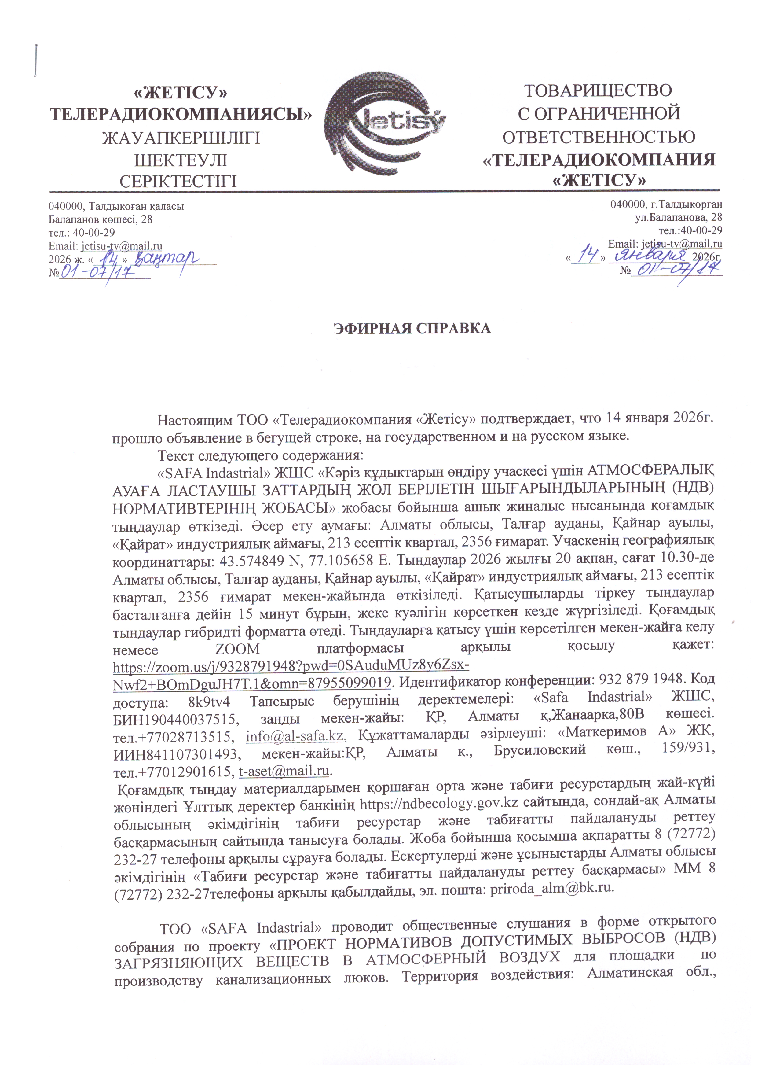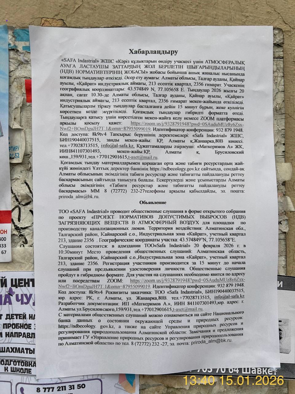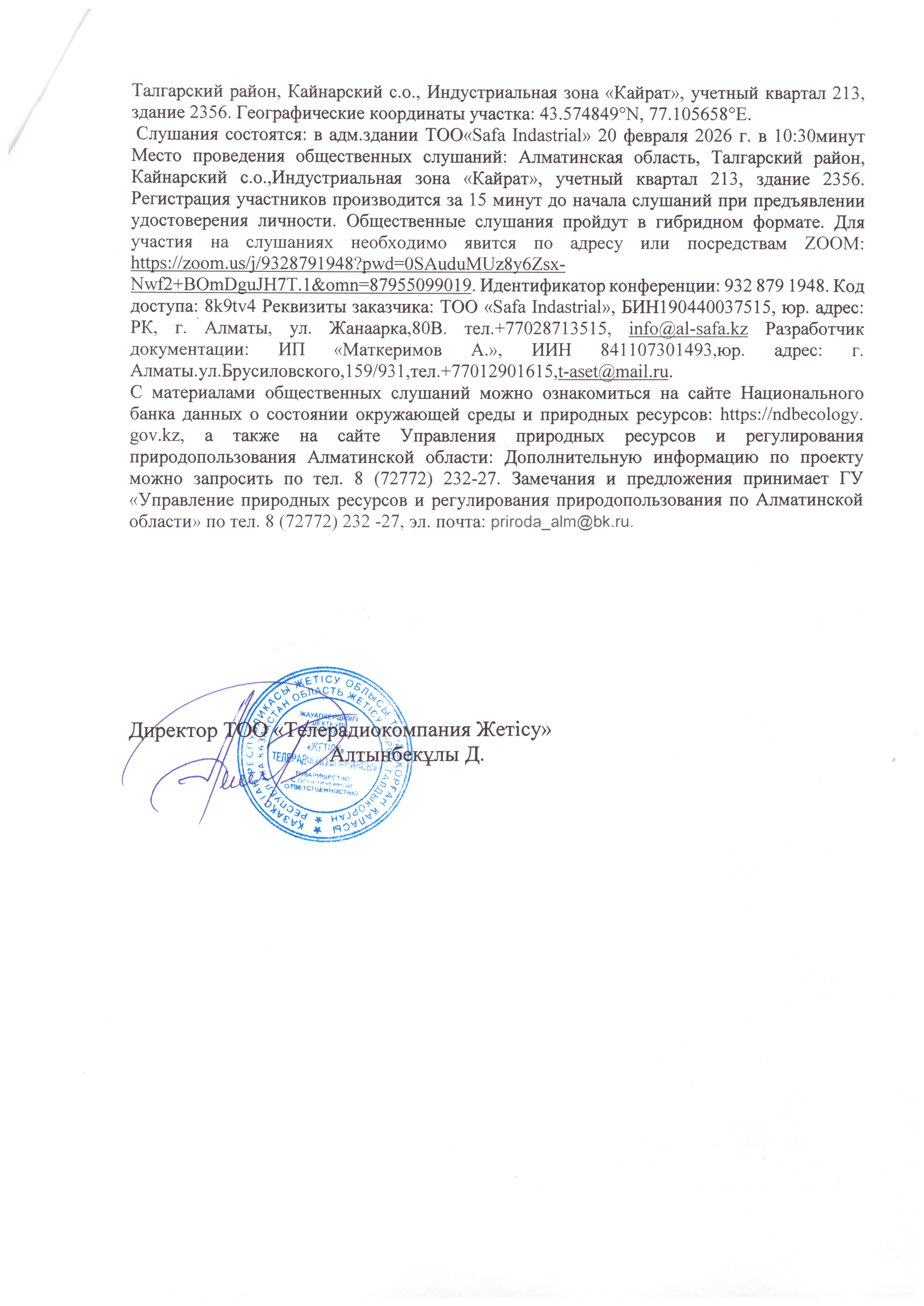 3. Общественные слушания организованны: Управление природных ресурсов и регулирования природопользования Алматинской области, 329267eco@mail.ru,