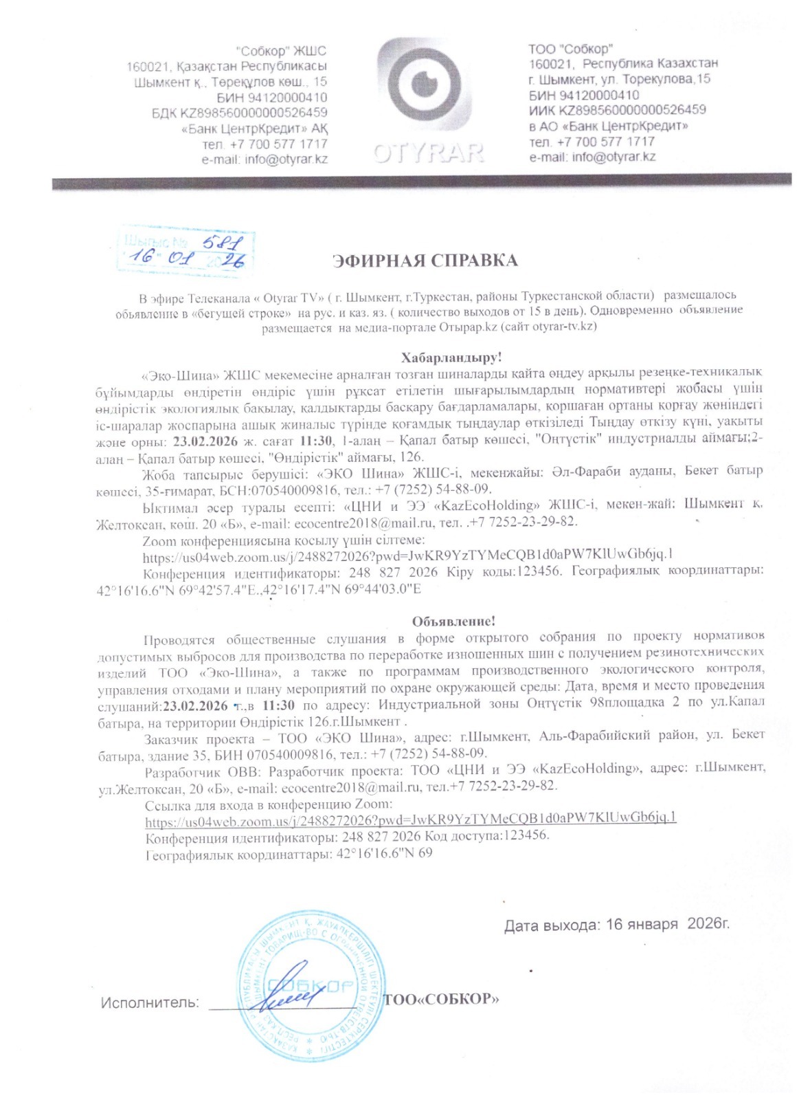 По проекту: ПРОЕКТ нормативов допустимых выбросов для производства по переработке изношенных шин с получением ре-зинотехнических изделий ТОО «Эко-Шина» расположенного площадка 1 по ул.Капал батыра, на территории Индустриальной зо-ны Оңтүстік 98площадка 2 по ул.Капал батыра, на территории Өндірістік 126г.Шымкент