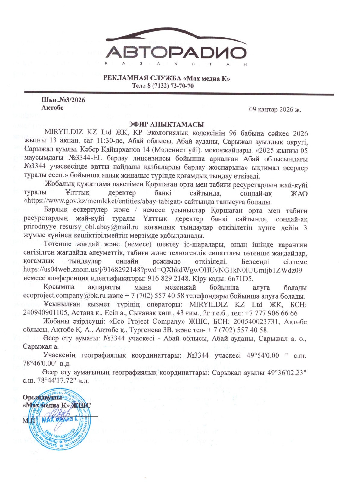 3. Общественные слушания организованны: Главный специалист УПР и ПР область Абай, prirodnyye_resursy_obl.abay@mail.ru,