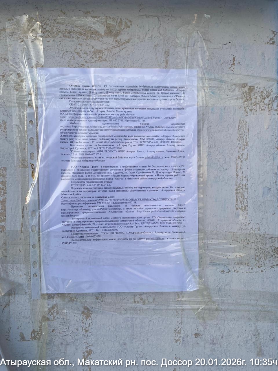 3. Общественные слушания организованны: Управление природных ресурсов и регулирования природопользования Атырауской области, atr.priroda@atyrau.gov.kz,