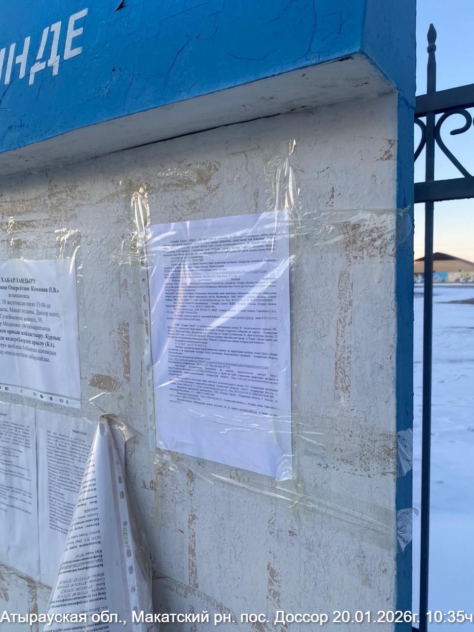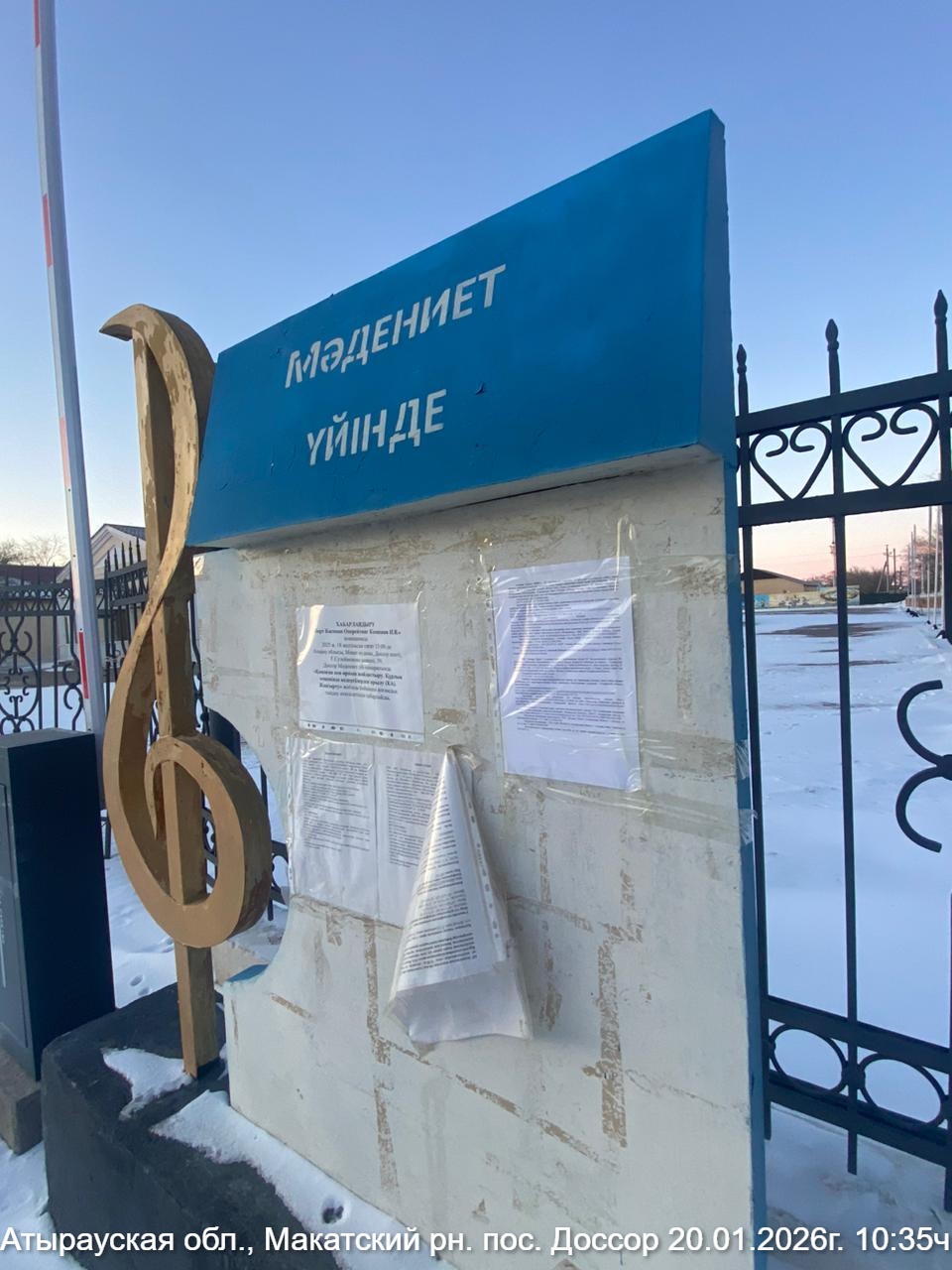 6.3. расположение мест, специально предназначенных для Размещения печатных объявлений (доски объявлений): Акимат поселка Доссор