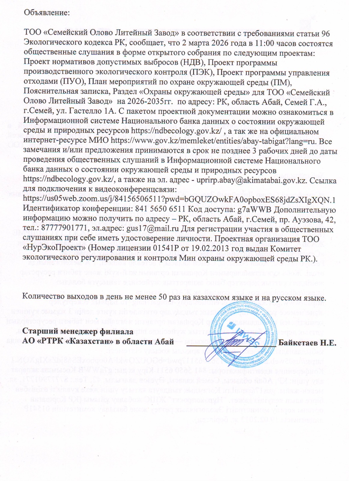 6. Объявление о проведении общественных слушаний на казахском и русском языках будет распространено следующими способами: