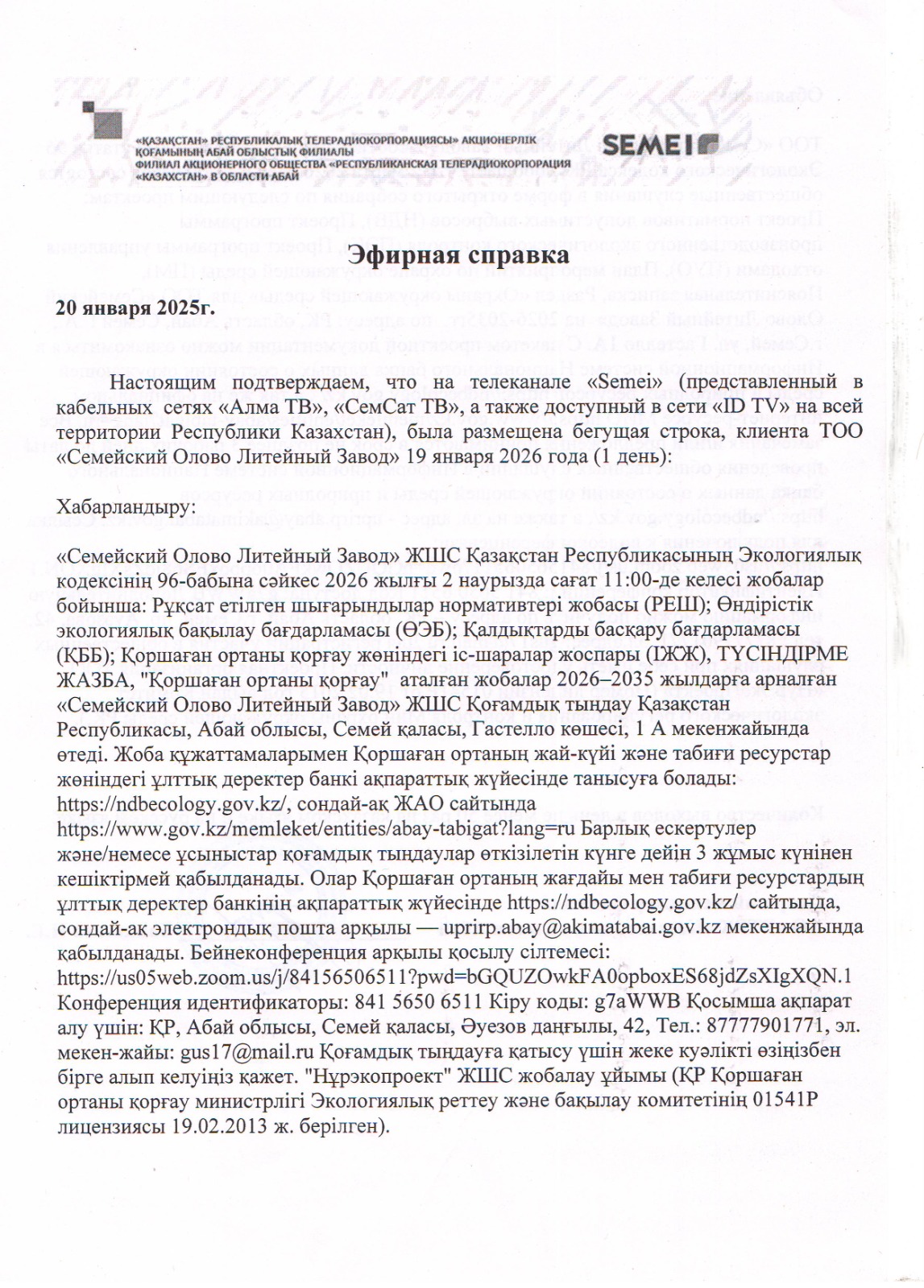 Подтверждающий документ о своевременном размещении объявления о проведении общественных слушаний не менее чем в одном теле- или радиоканале