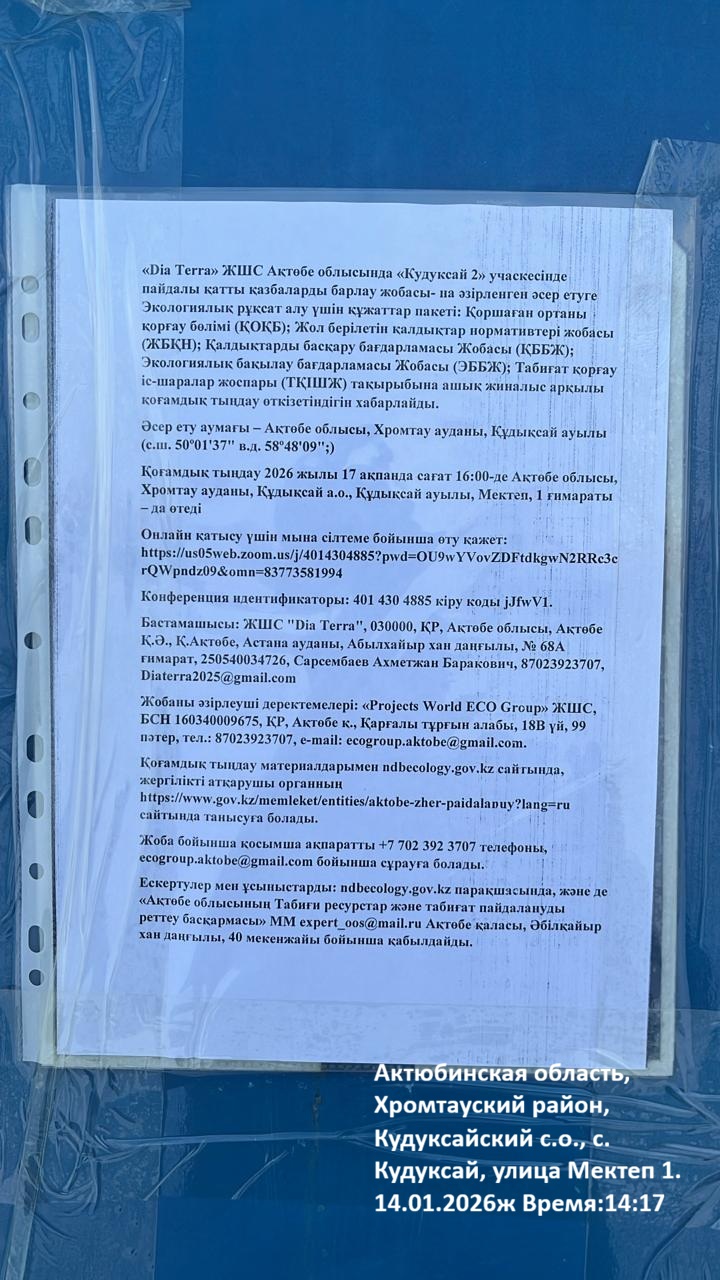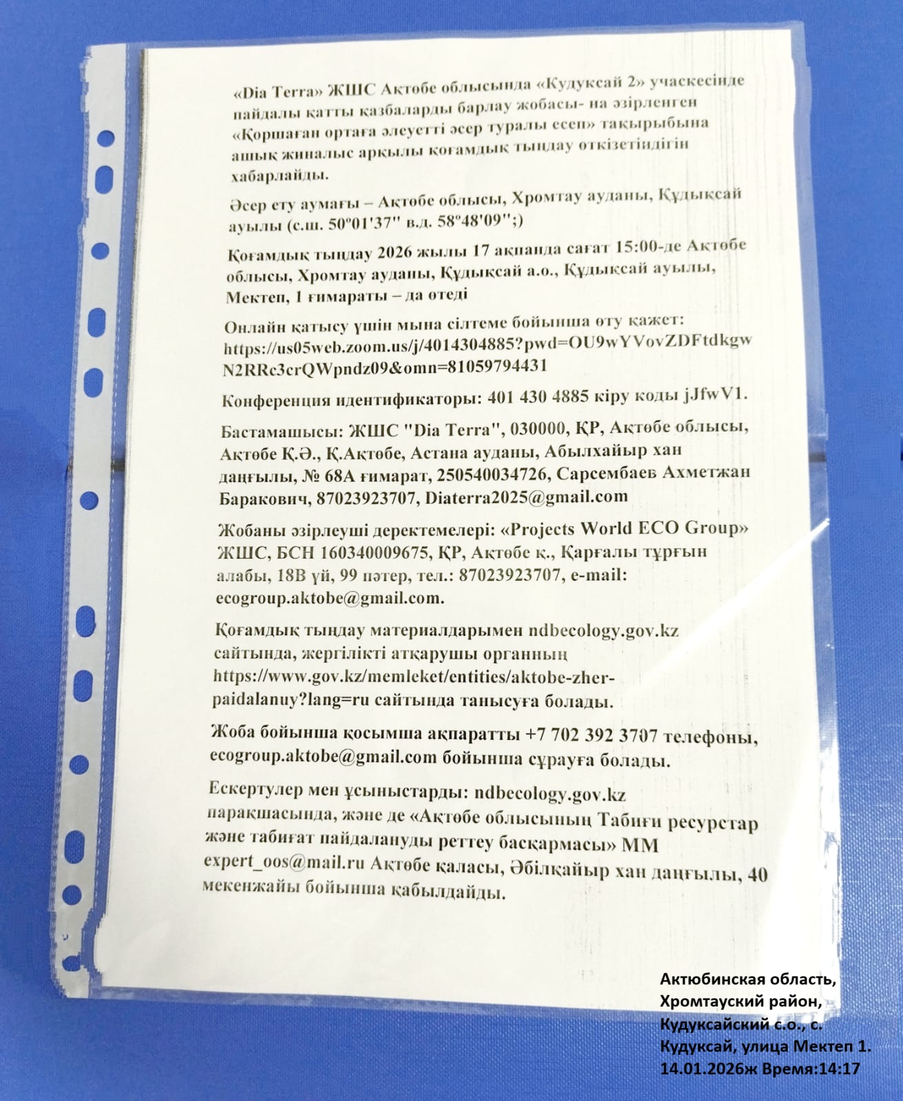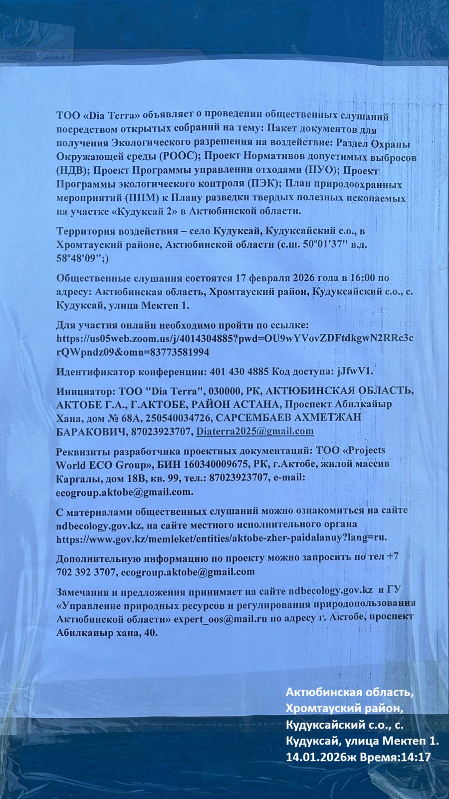 По проекту: ТОО «Dia Terra» «Отчет о возможных воздействиях» к Плану разведки твердых полезных ископаемых на участке «Кудуксай 2» в Актюбинской области.