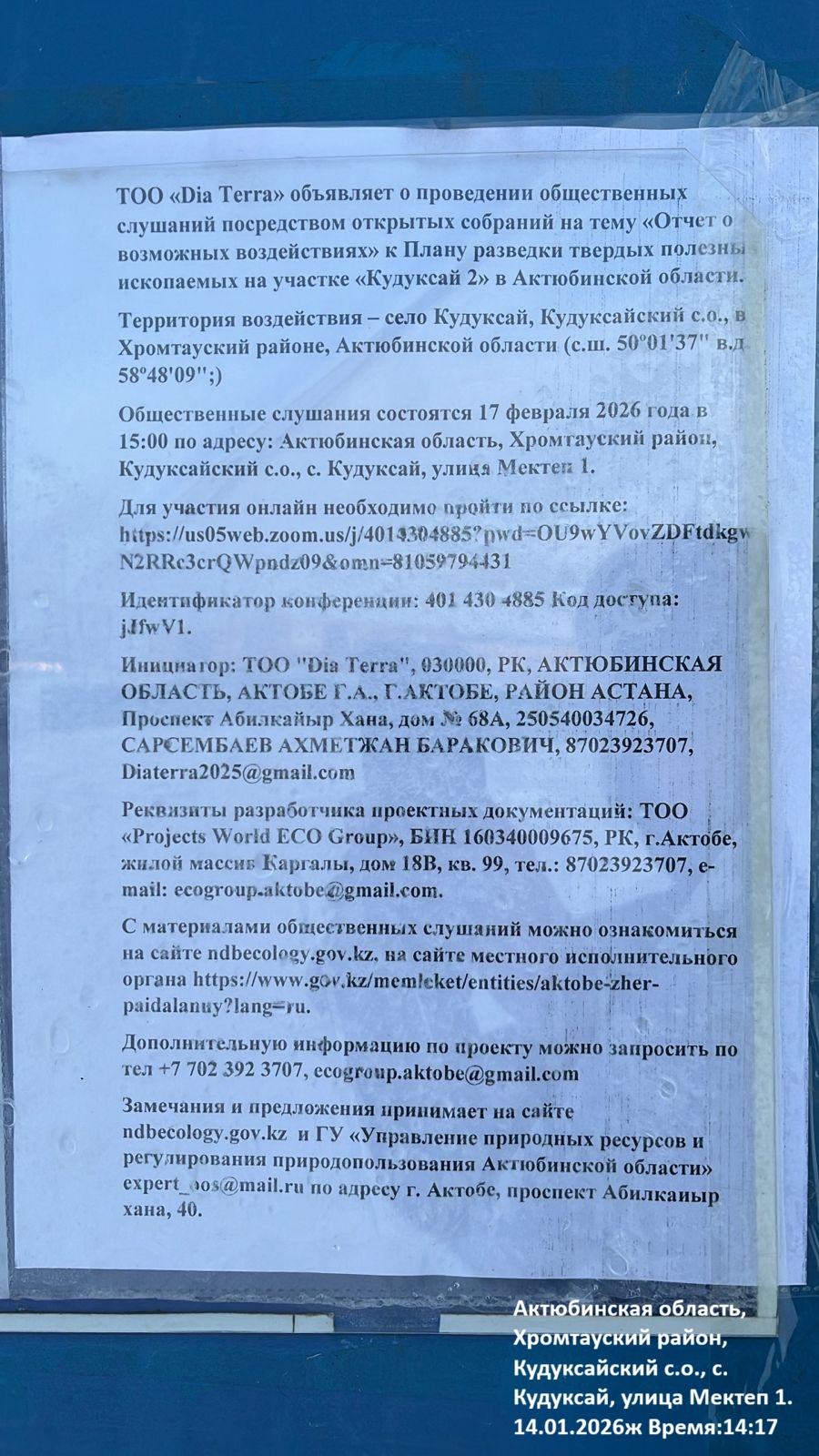 3. Общественные слушания организованны: Управление природных ресурсов и регулирования природопользования Актюбинской области, expert_oos@mail.ru,
