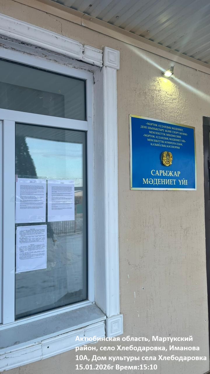 6.3. расположение мест, специально предназначенных для Размещения печатных объявлений (доски объявлений): Актюбинская область, Мартукский район, Хлебодаровский с.о., с.Хлебодаровка, Иманова 10А, Дом культуры села Хлебодаровка