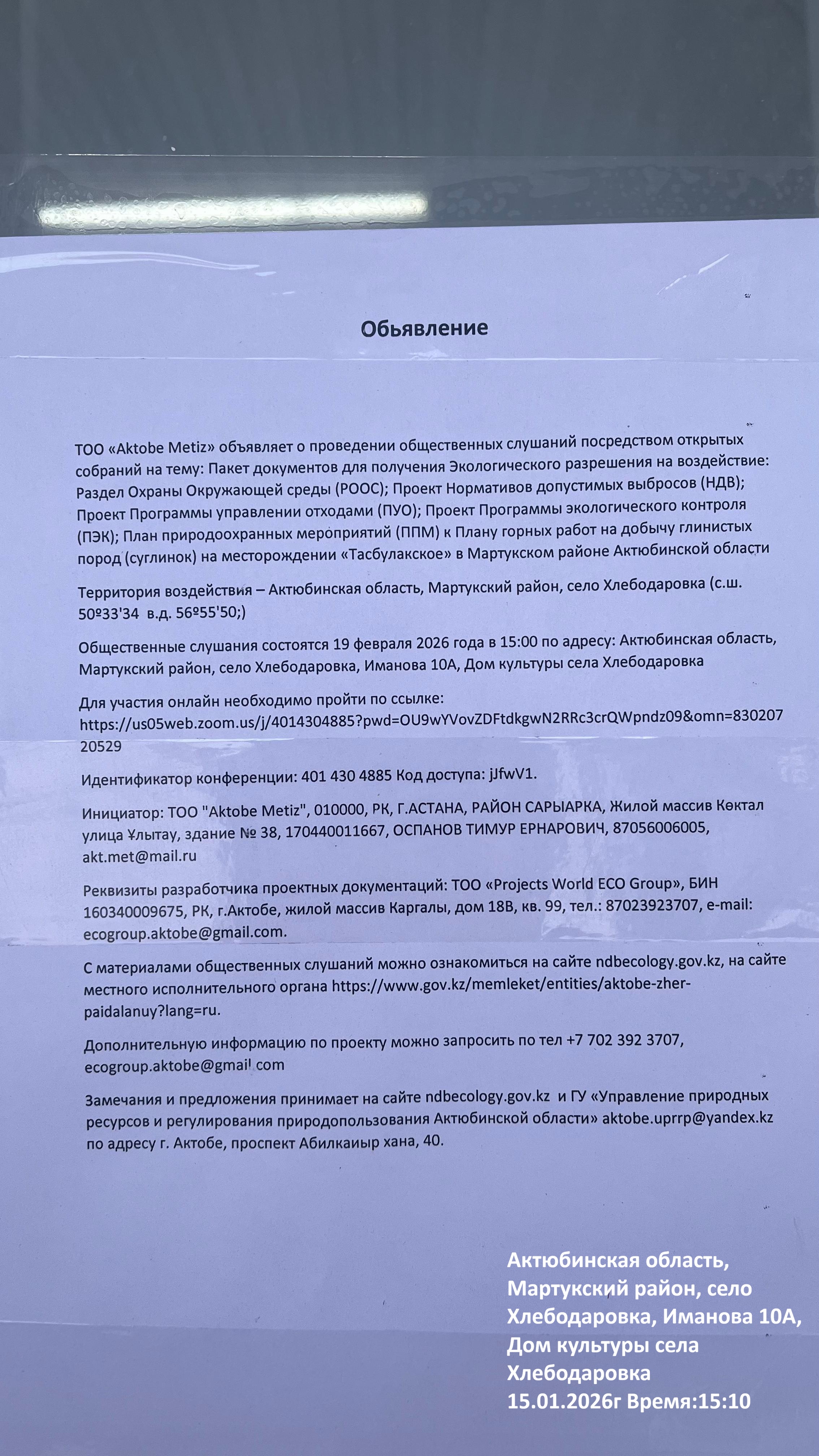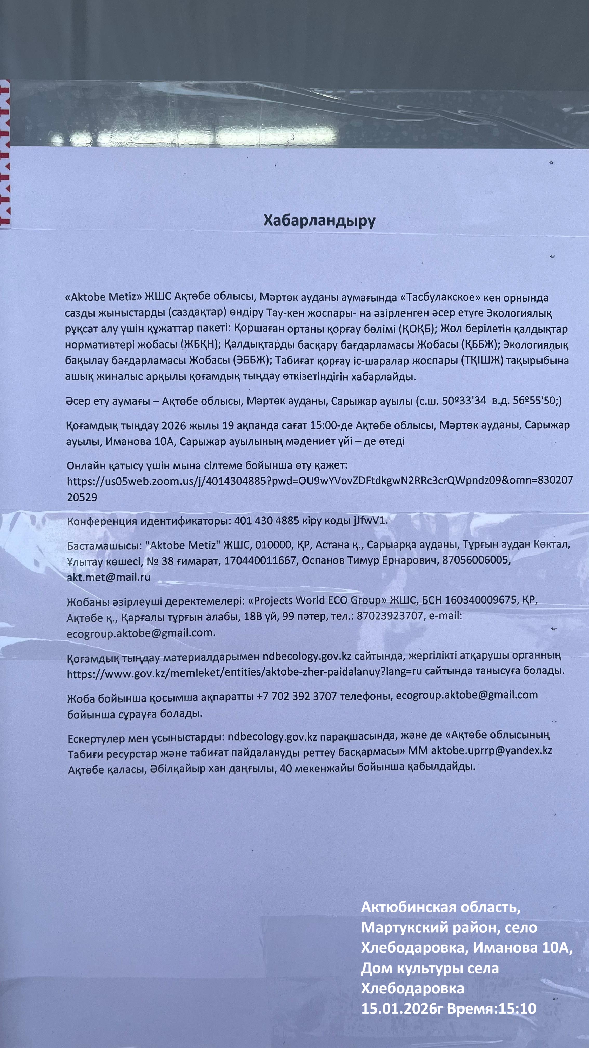 3. Общественные слушания организованны: Управление природных ресурсов и регулирования природопользования Актюбинской области, expert_oos@mail.ru,