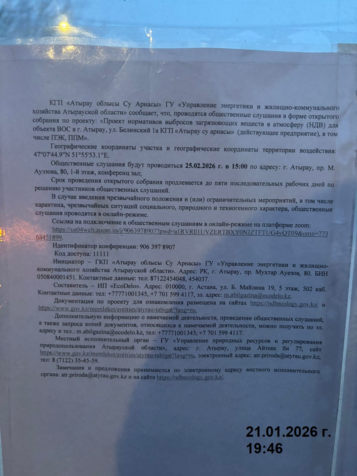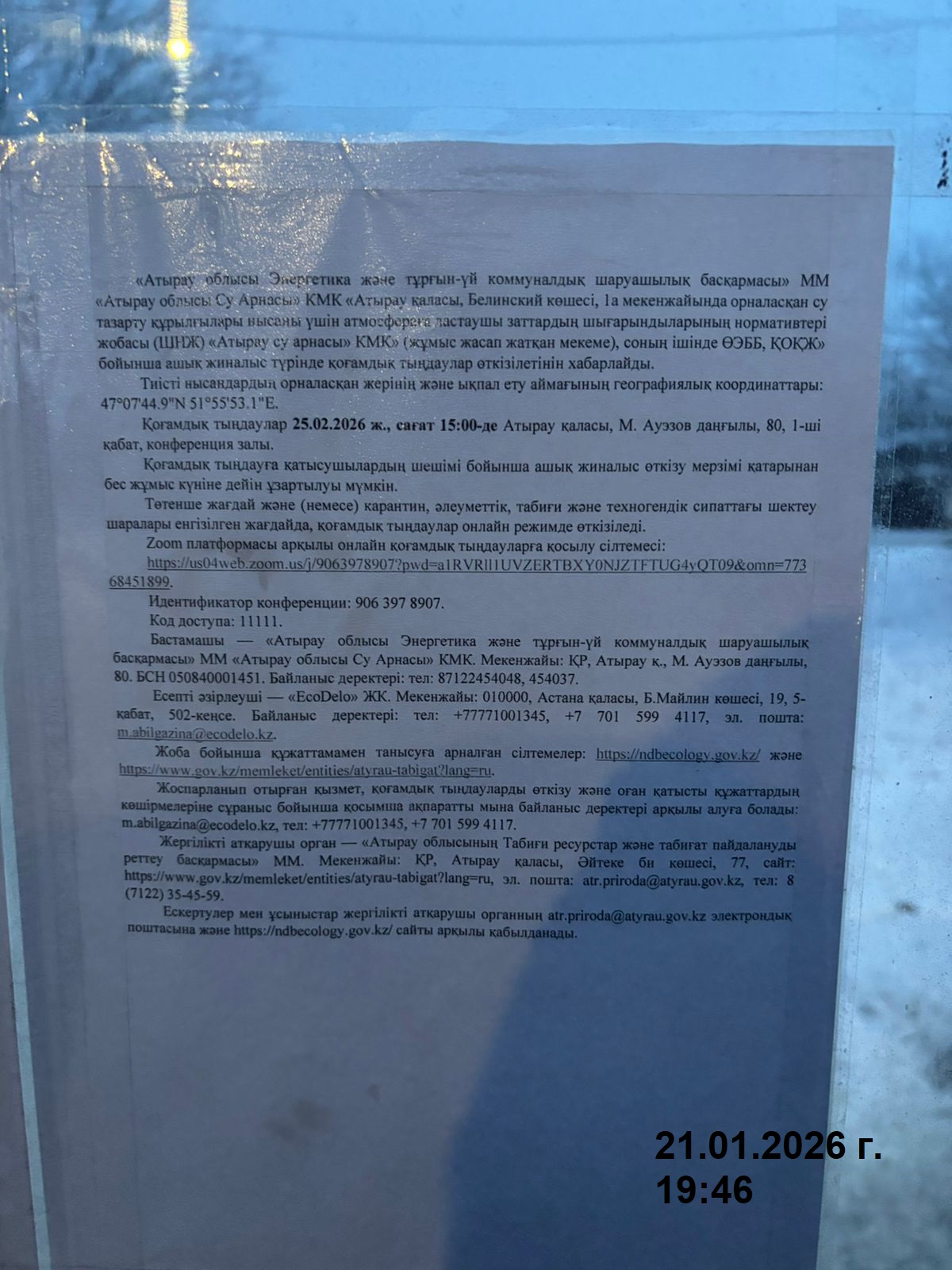 3. Общественные слушания организованны: Управление природных ресурсов и регулирования природопользования Атырауской области, atr.priroda@atyrau.gov.kz,