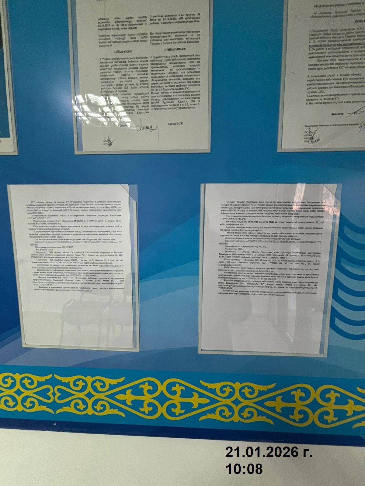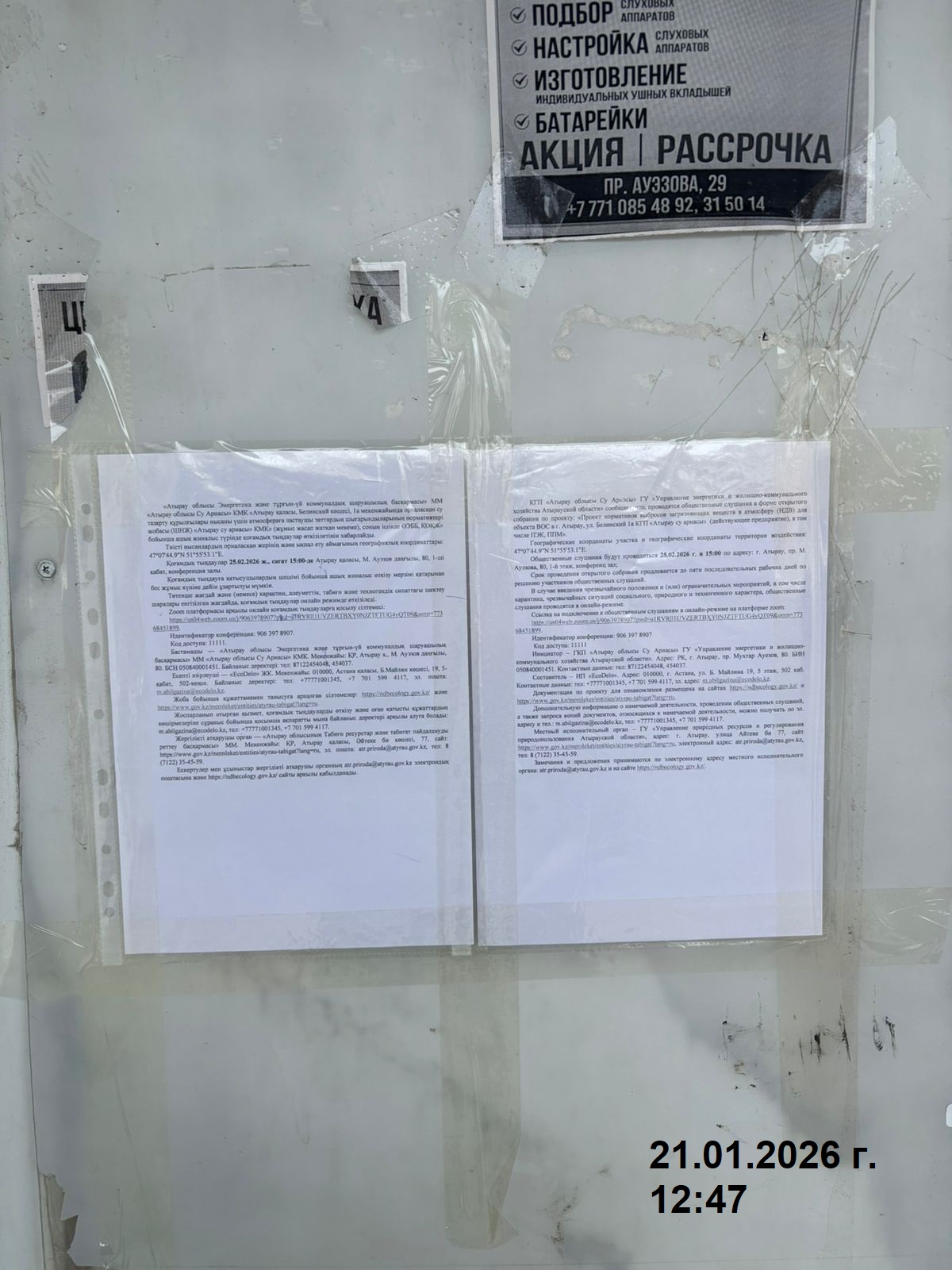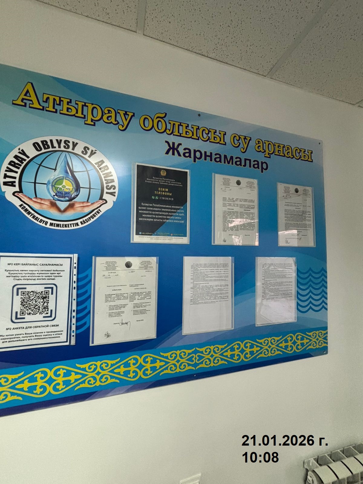 6.3. расположение мест, специально предназначенных для Размещения печатных объявлений (доски объявлений): Остановка "Адилет" по ул. Муса Баймыханова, останова "Маслопром" по пр. Мухтара Ауэзова, доска объявлений КГП «Атырау Су Арнасы» по адресу пр. М. Ауэзова, 80.