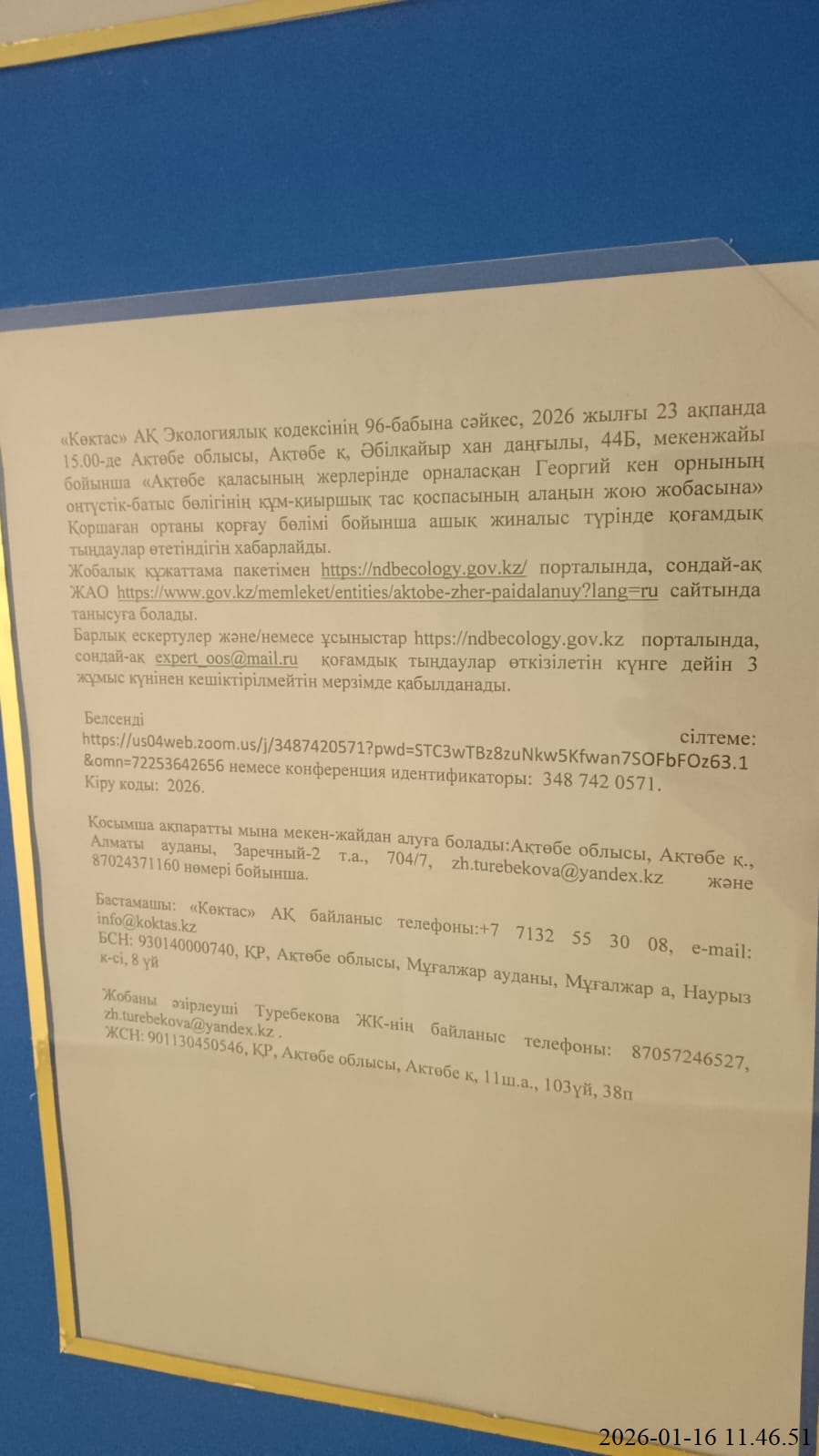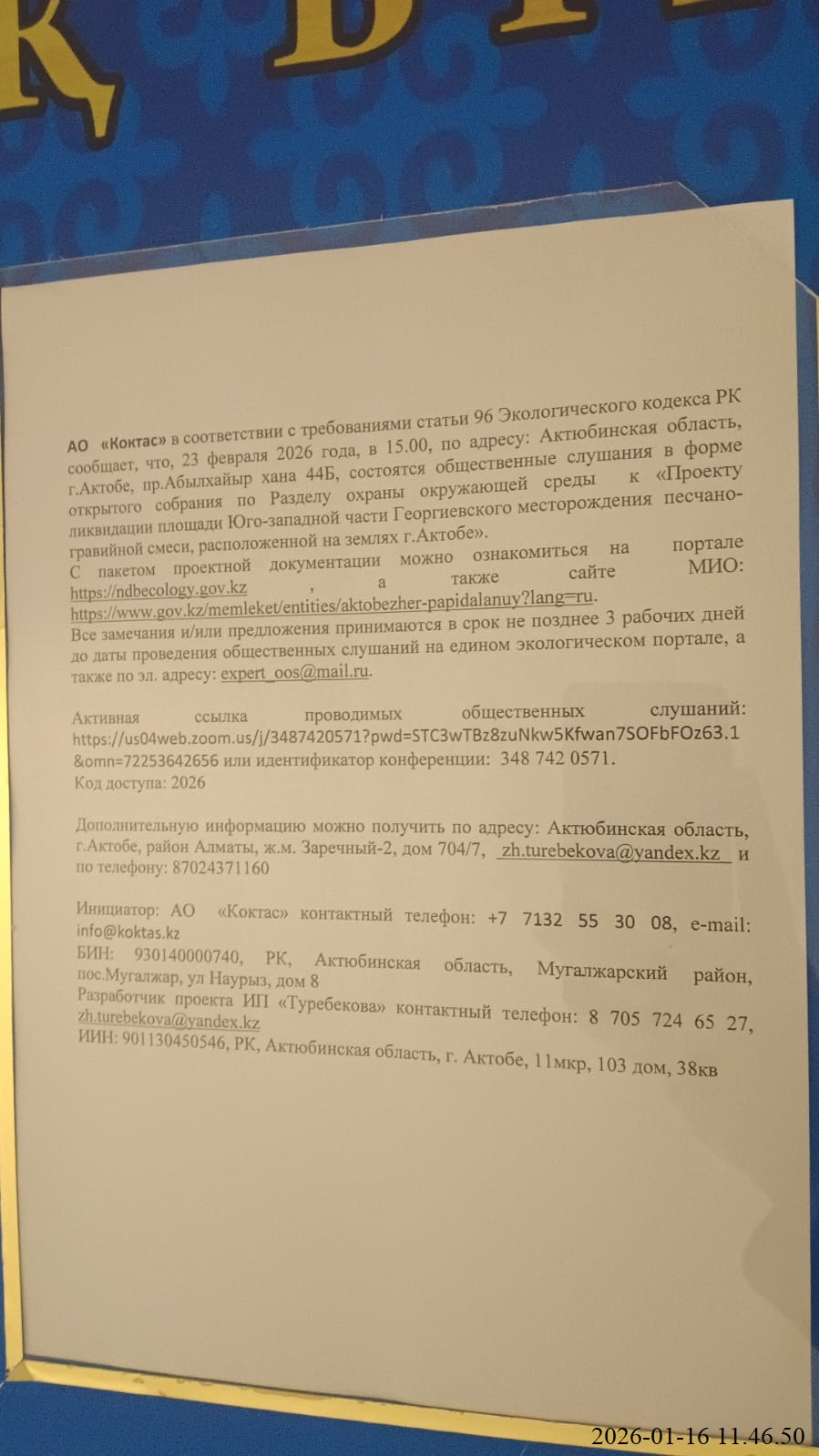 3. Общественные слушания организованны: Управление природных ресурсов и регулирования природопользования Актюбинской области, expert_oos@mail.ru,